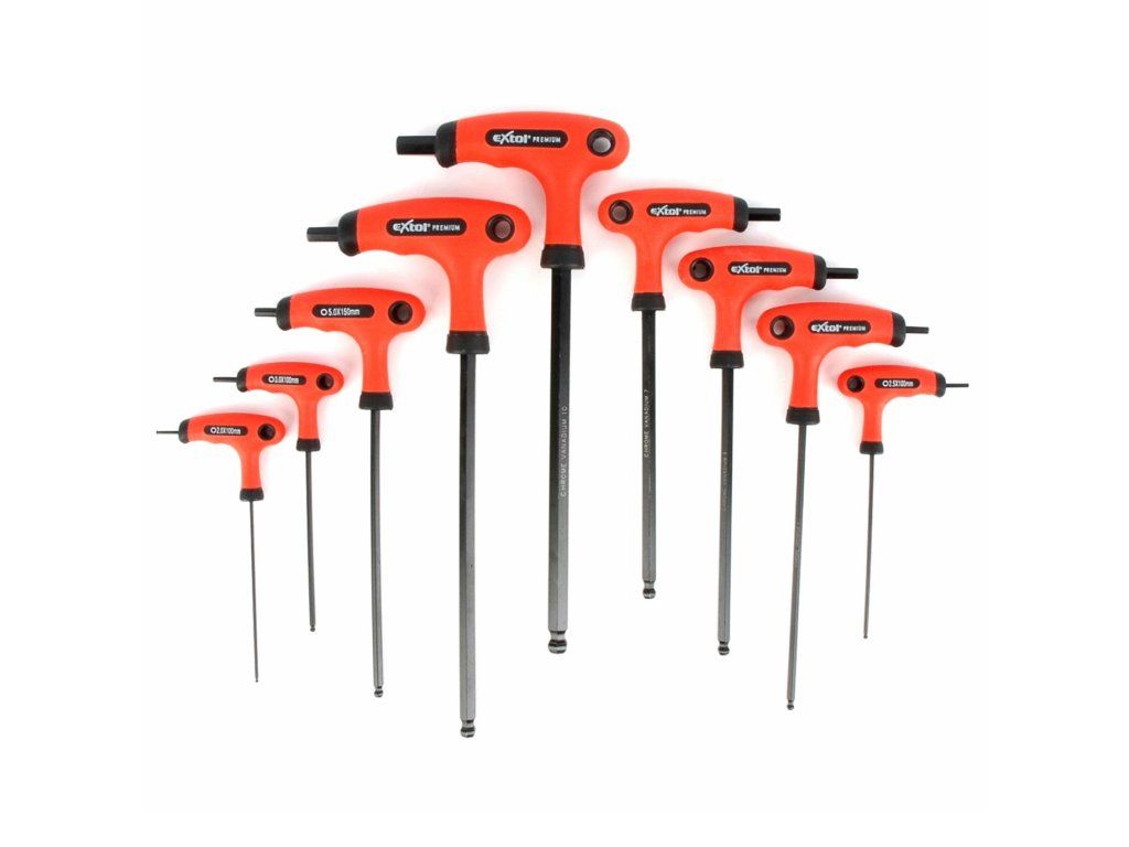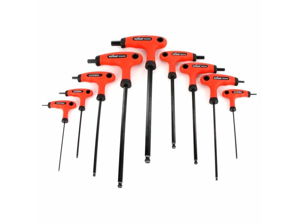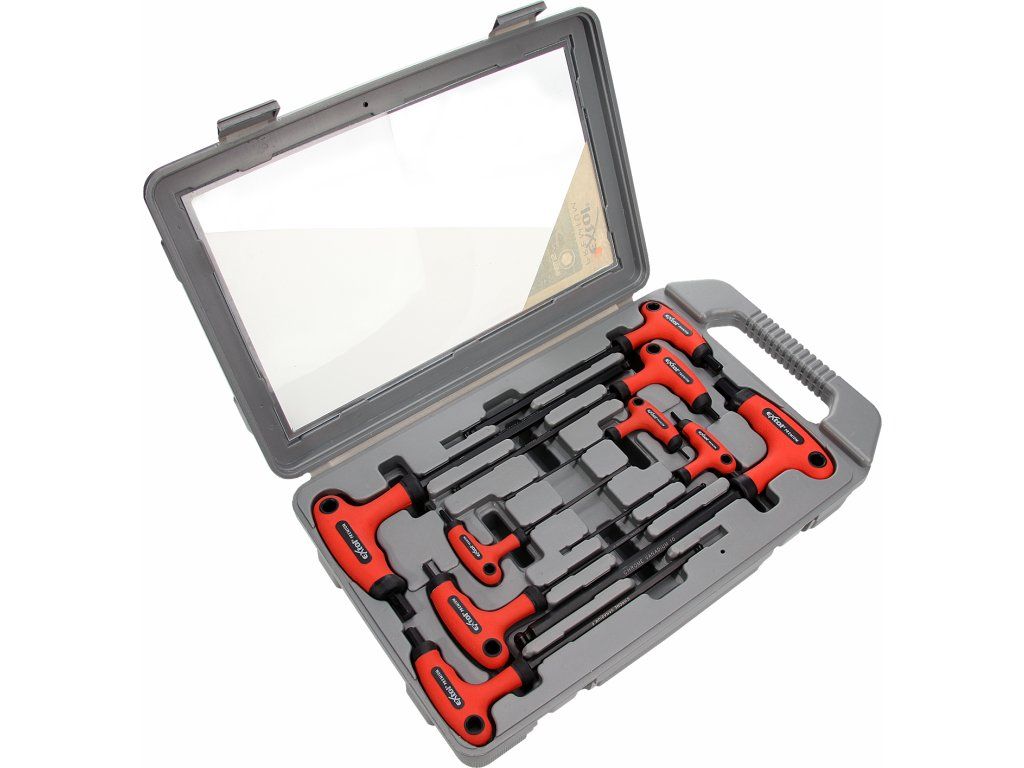 Komplet tipk CrV Allen s kroglo (lahko se odbije do 25°) 2; 2,5; 3; 4; 5; 6; 7; 8; 10 mm. Za prenos večje sile, T-ročaj.