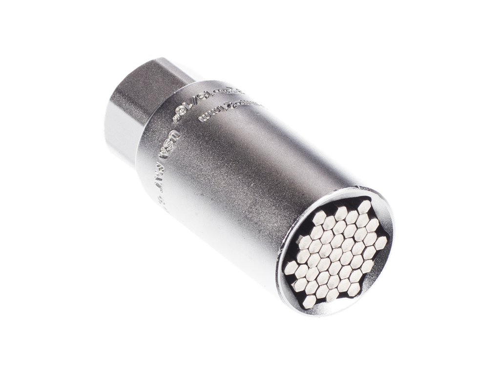 Univerzalni ključ za vtičnice najpogostejših velikosti 9 - 21 mm za vijake, matice (šesterokotne in kvadratne), vijačne kljuke itd. S seboj ni več potrebno nositi celotnih sklopov podaljškov, vse je rešeno s tem univerzalnim. Zasnovan za uporabo s 3/8" zaskočnim zaskokom. Material: CrV jeklo, polirano.