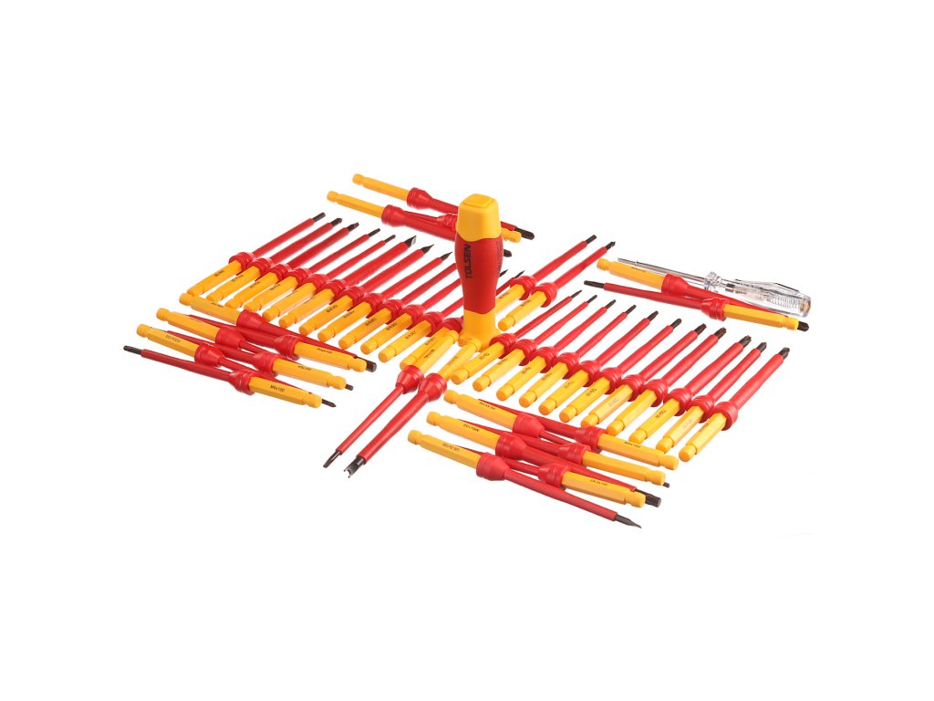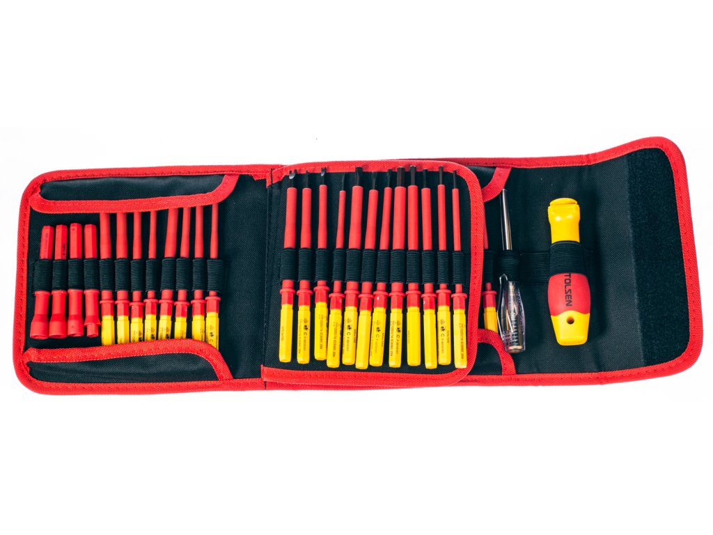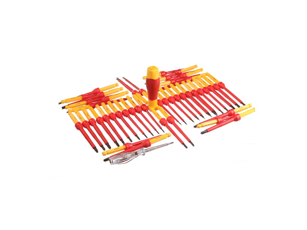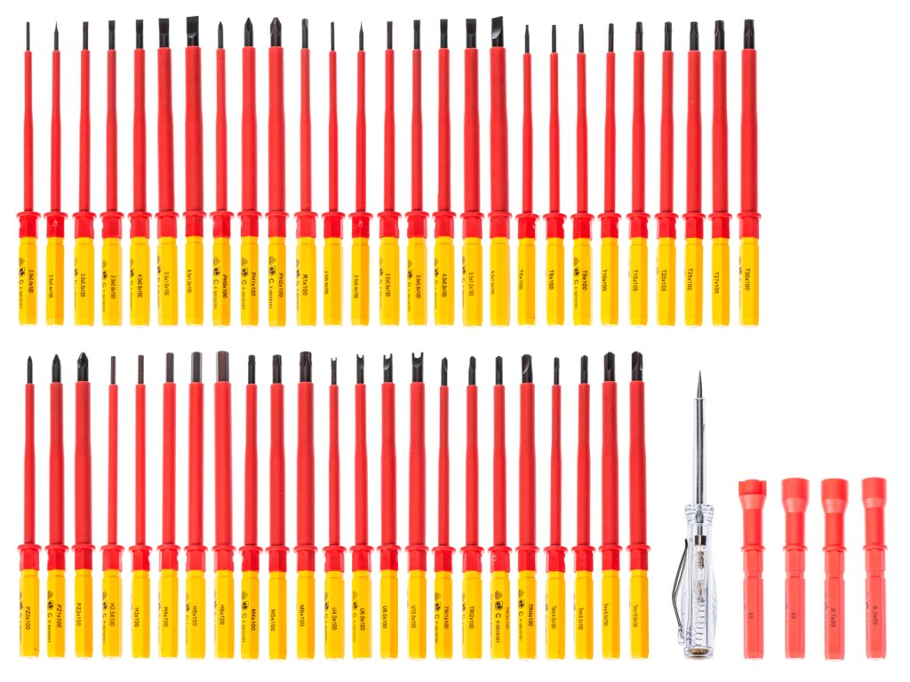 Vključuje izvijače dolžine 100 mm, tip SL2.0; SL2.5; SL3.0; SL3.5; SL4.0; SL5.5 in SL6.5; potem PH0; PH1 in PH2; PZ0; PZ1 in PZ2; T6; T8; T9; T10; T15; T20; T25; T27 in T30; H2.5; H3.0; H4.0; H5.0 in H6.0; R1 in R2; TRI1; TRI2; TRI3 in TRI4; TORO4; TORO6; TORO8 in TORO10; M4; M5; in M6; U100 × 4; 6; 8; 10; ključi stikalne plošče 89 × 6.3; 8,1; 9; 14; Poleg tega je preizkuševalec napetosti 3 × 70 in ročica za nastavitev 31 × 105. Vse je shranjeno v tekstilni vrečki.