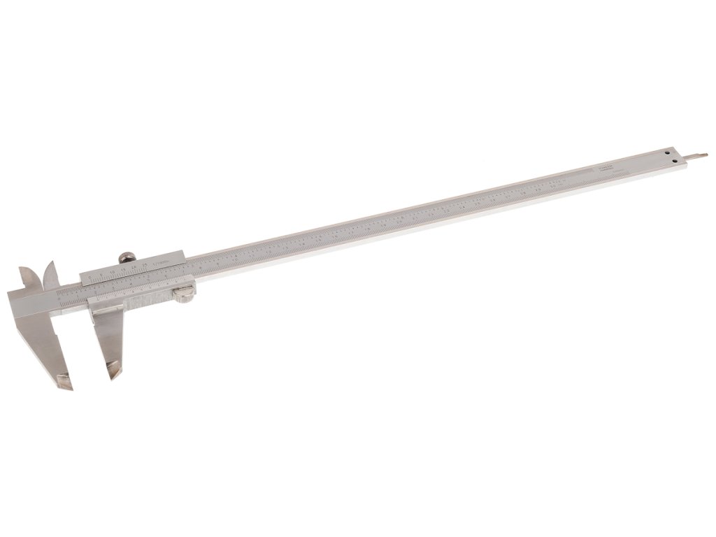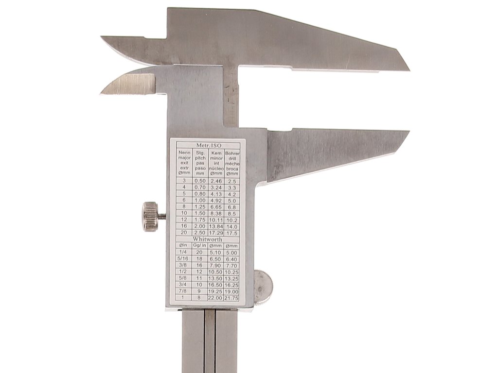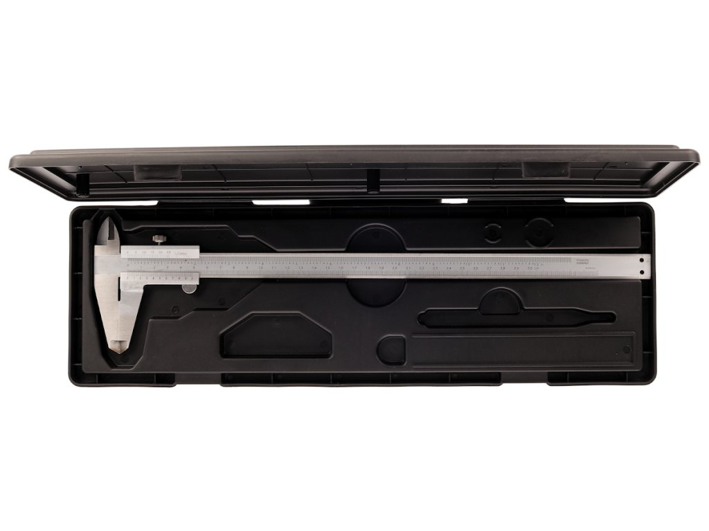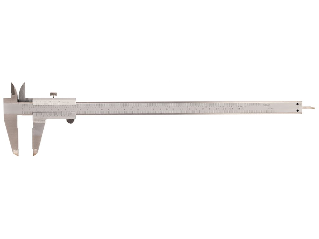 Merilno območje 0 – 300 mm, odčitavanje 0,02 mm, previs čeljusti 62 mm. Vključena je navedba globine.
