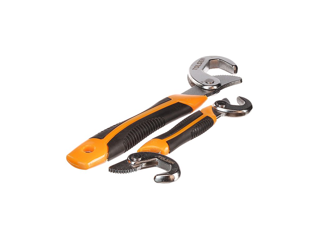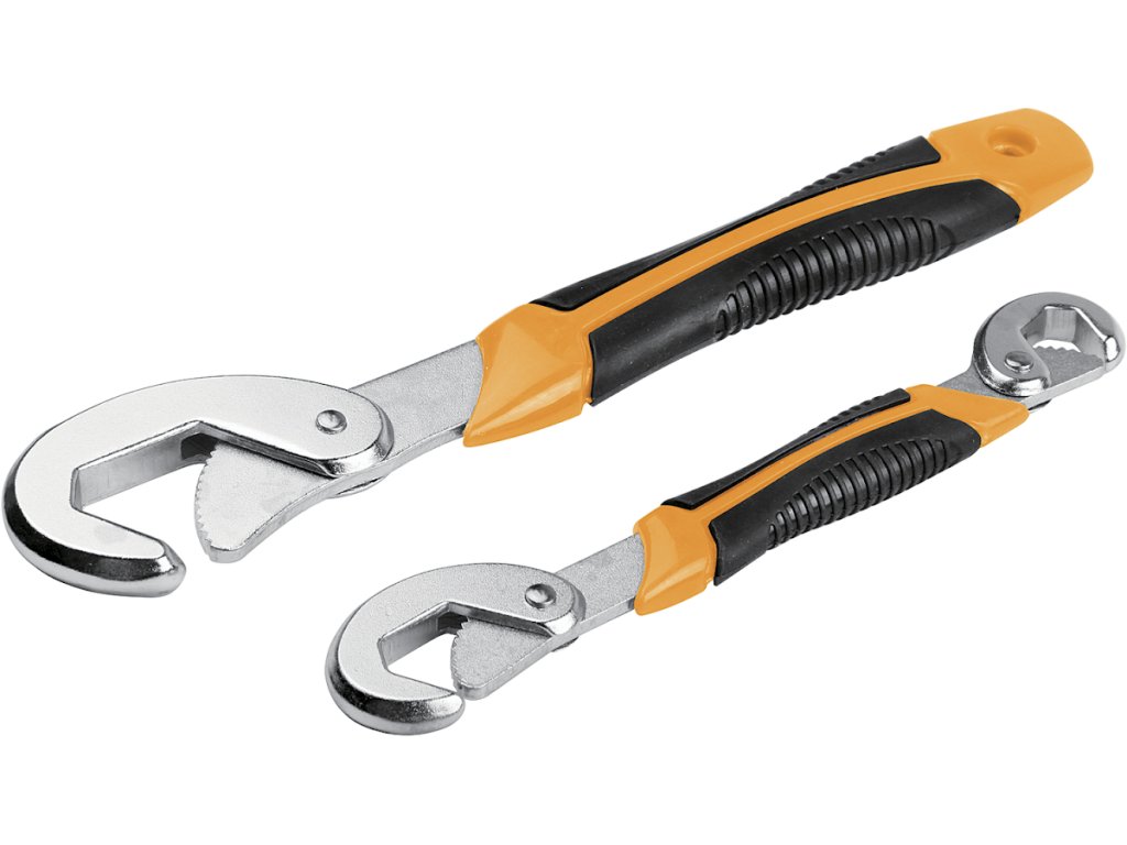 Komplet je sestavljen iz dveh samozapornih ključev. Manjši je obojestranski z razponi od 9-14 in 15-22 mm, večji je enostranski 23-32 mm. Ključi so zasnovani tako, da se pritisk izvaja na treh točkah naenkrat - to zagotavlja močan oprijem na vijaku. Imajo posebno vpenjalno glavo, ki se takoj in enostavno prilagodi vsakemu vijaku, primerni so tudi za pritrditev katere koli cevi ali kot univerzalni pomočnik pri popravilih avtomobilov. Ključi so izdelani iz visokokakovostnega ogljikovega jekla. Dimenzije: majhna 215x36x16 mm, velika 285x50x22 mm.