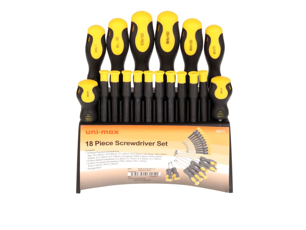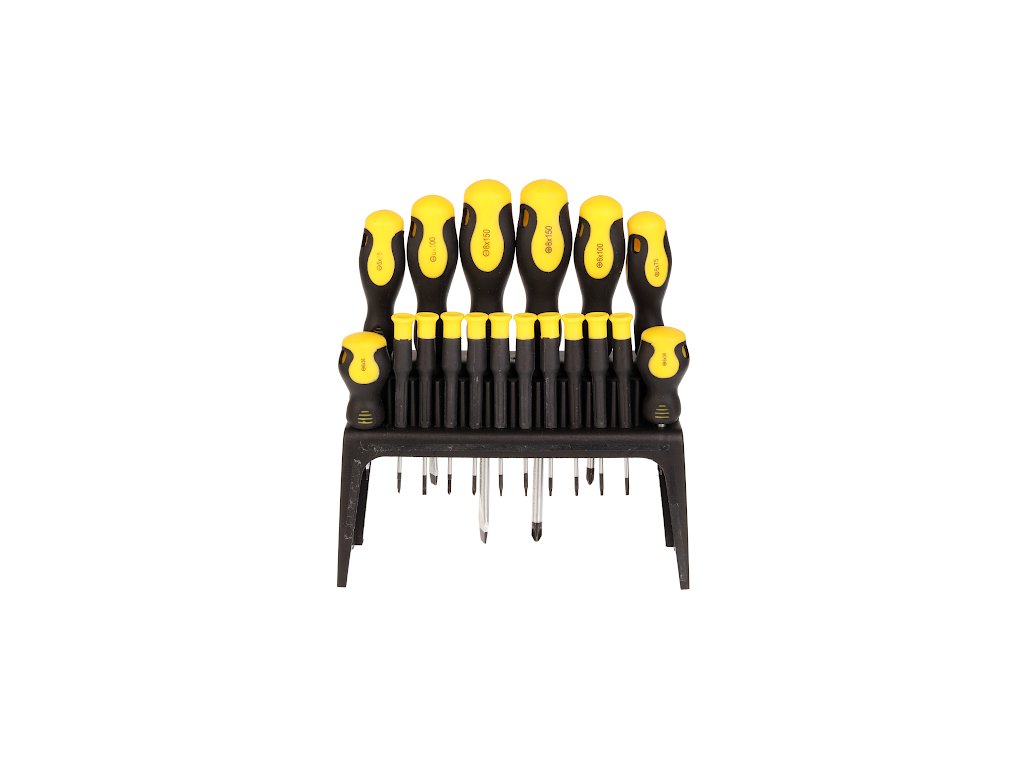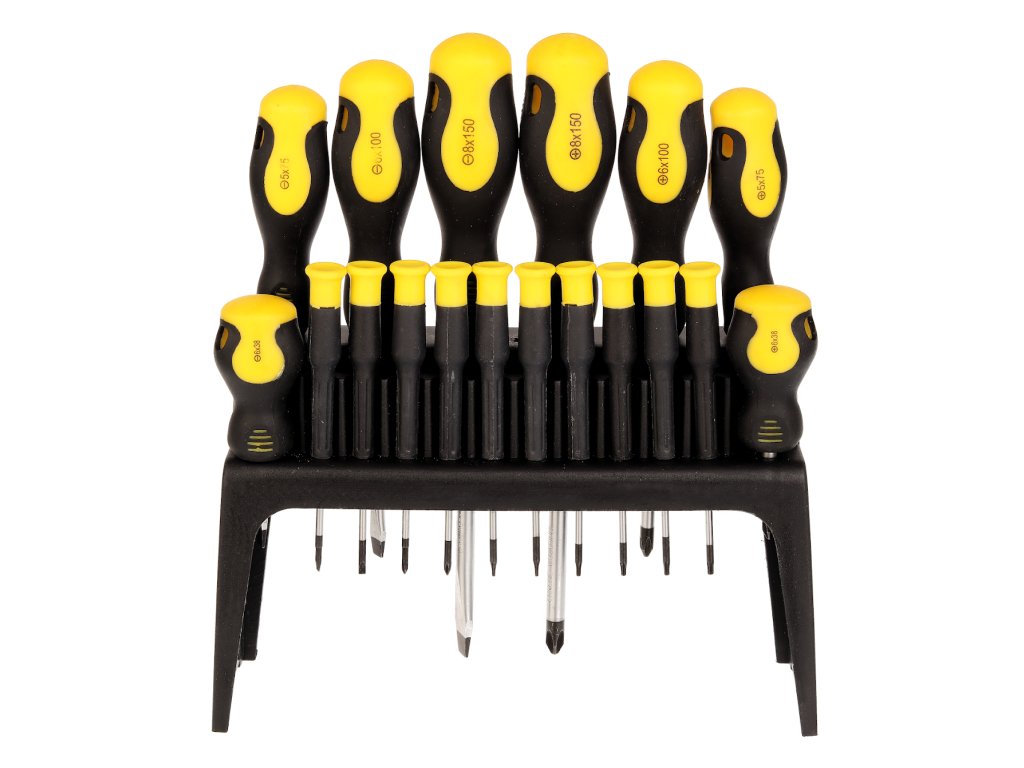 Vsebuje visokokakovostne izvijače: ravne 6 × 38; 5 × 75; 6 × 100, 8 × 150 mm; Phillipsovi izvijači PH2 × 38, PH1 × 75, PH2 × 100, PH3 × 150 mm in komplet 10 natančnih izvijačev. Material: CrV jeklo, PP+TPR plastični ročaj, plastično stojalo.