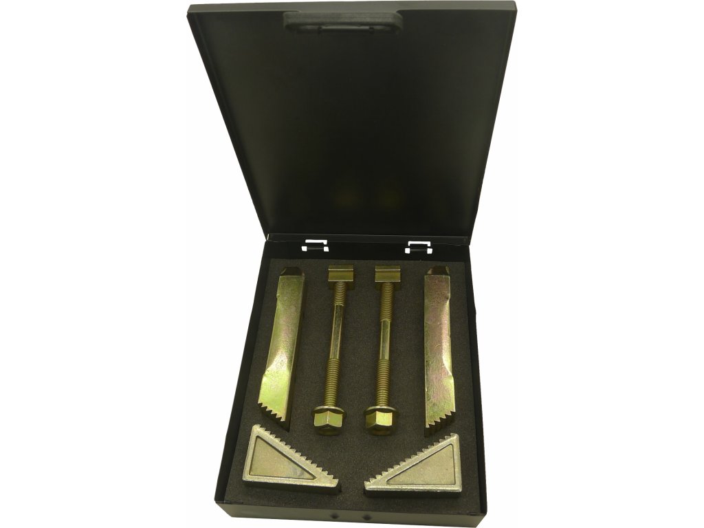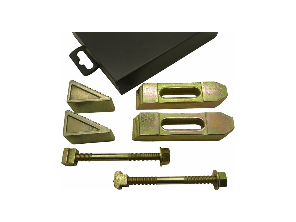 Par objemk za trdno pritrditev strojno obdelanega materiala na strojno delovno mizo z 8 mm T-režami. Komplet vsebuje 2 25 × 25 × 42 mm distančnike, 2 100 × 25 × 12 mm sponke in 2 M6 zatezne vijake.