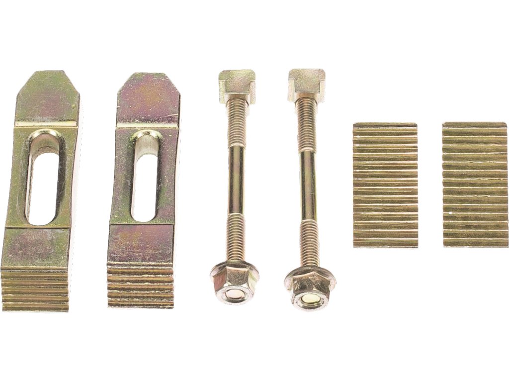 Par objemk za trdno pritrditev obdelanega materiala na strojno mizo z utori v obliki črke T 10 mm. Komplet vsebuje 2 kosa 25 × 25 × 42 mm distančnikov, 2 kosa 100 × 25 × 15 mm sponk in 2 kosa M8 × 100 mm zategovalnih vijakov.