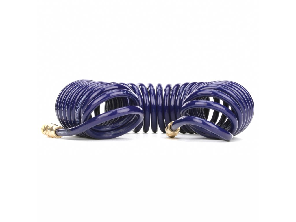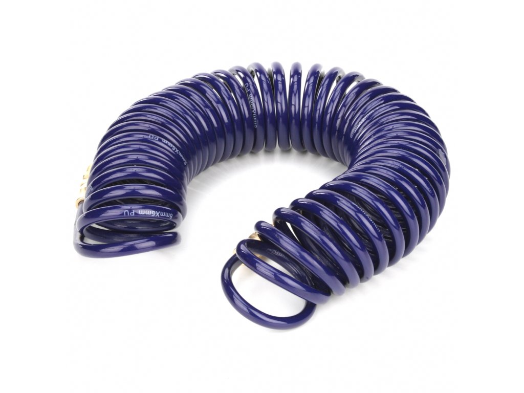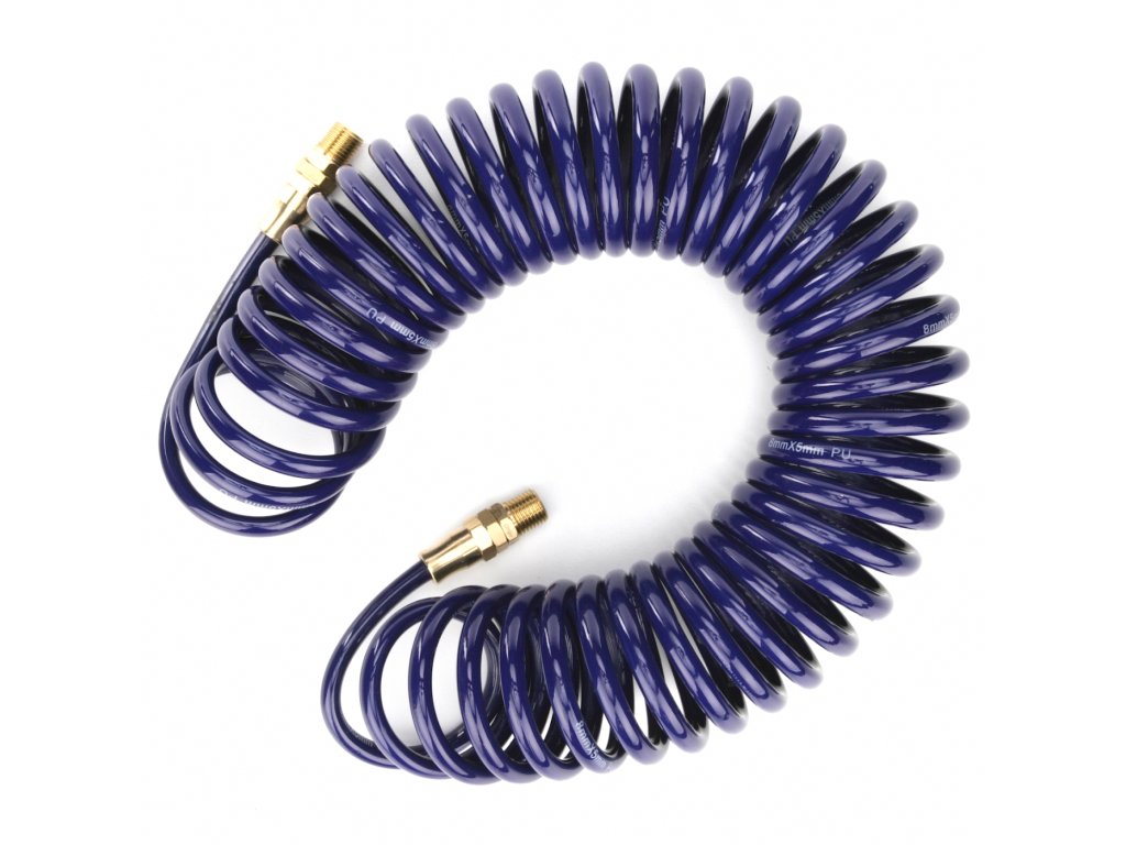 Fleksibilna PU cev je primerna za delavnice, kjer je potrebna večja vzdržljivost. Dimenzije 5 × 8 mm, raztegnjena spiralna dolžina 7,5 m. Opremljen z navojnim priborom G 1/4" na obeh koncih.