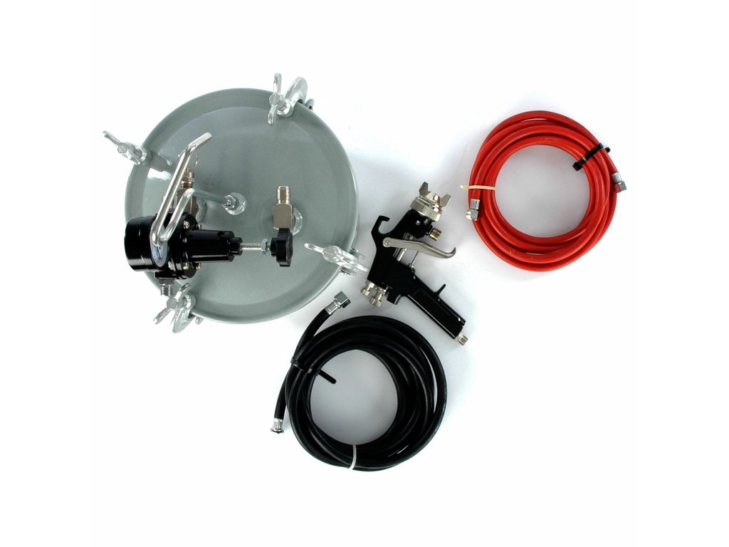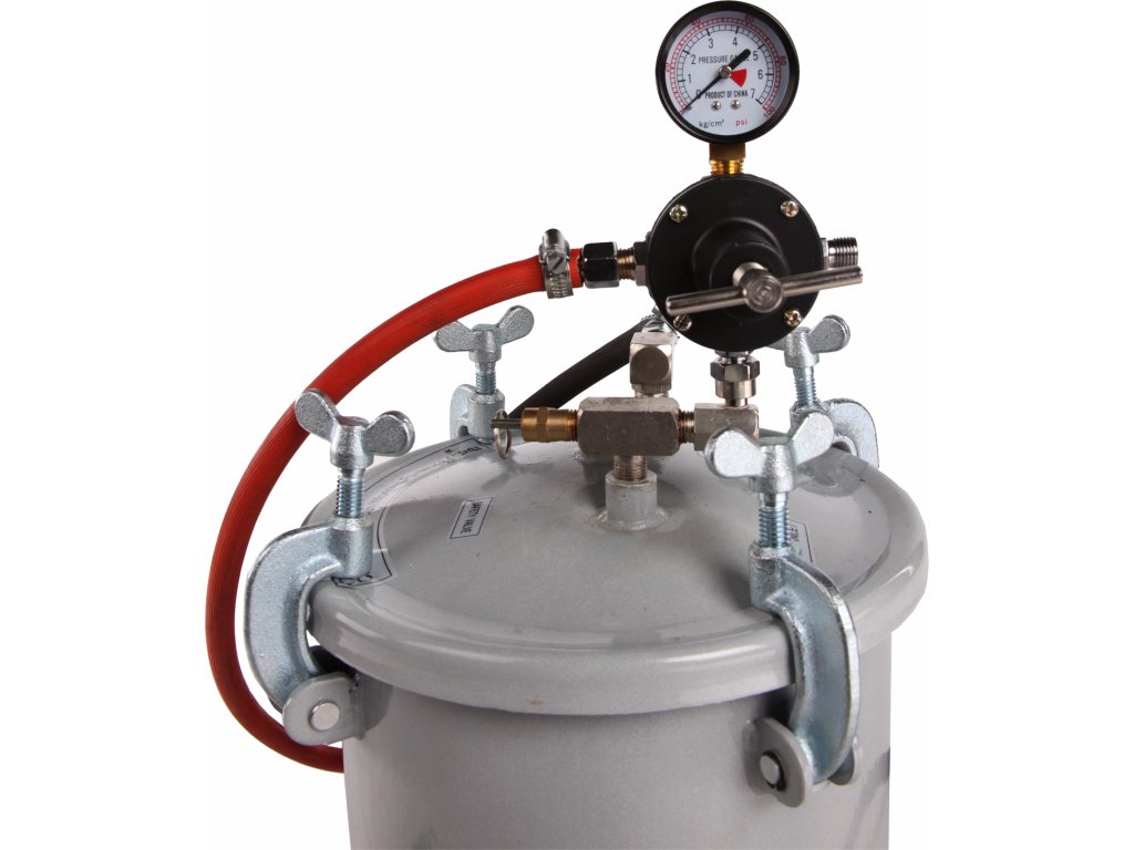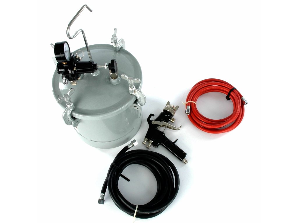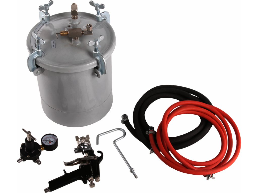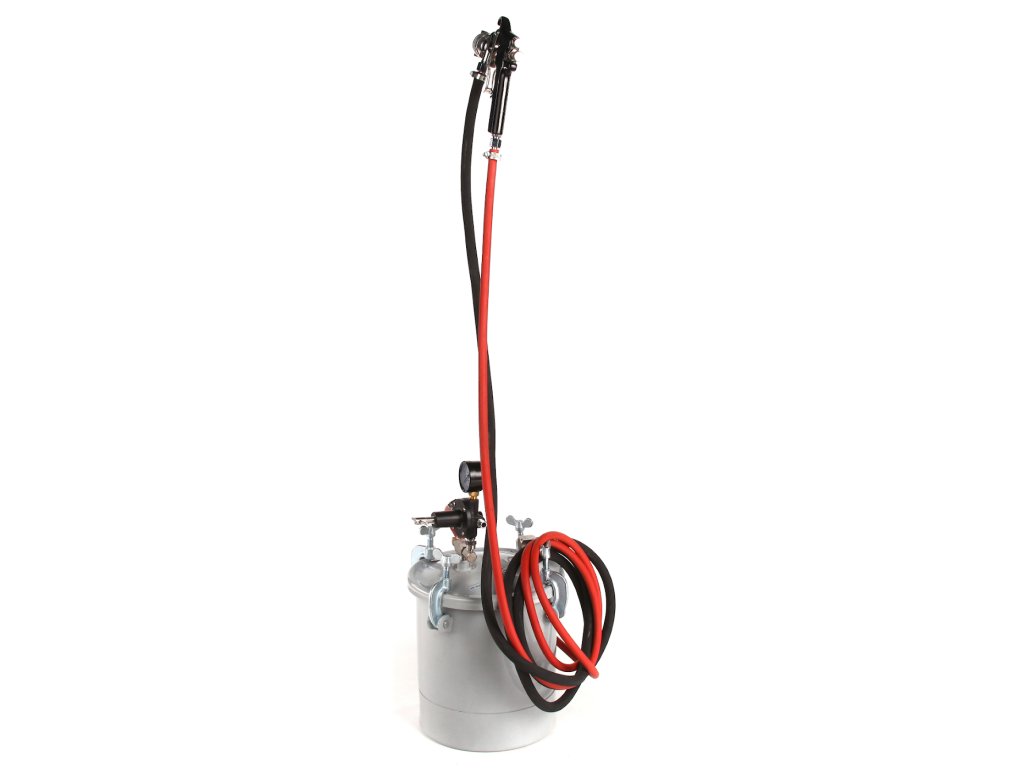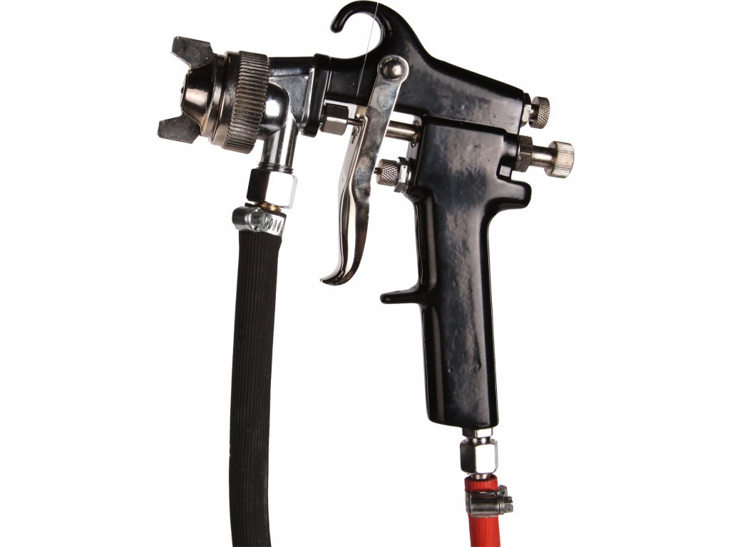 Brizgalno pištolo z zunanjo posodo 8 l. Šoba 1,8 mm, dolžina cevi 3,5 m. Delovni tlak 3,5 – 5 barov. 1/4" povezava. Primerno tudi za barve na vodni osnovi.