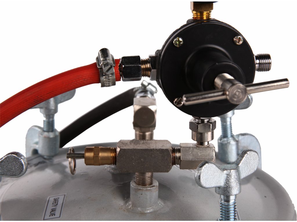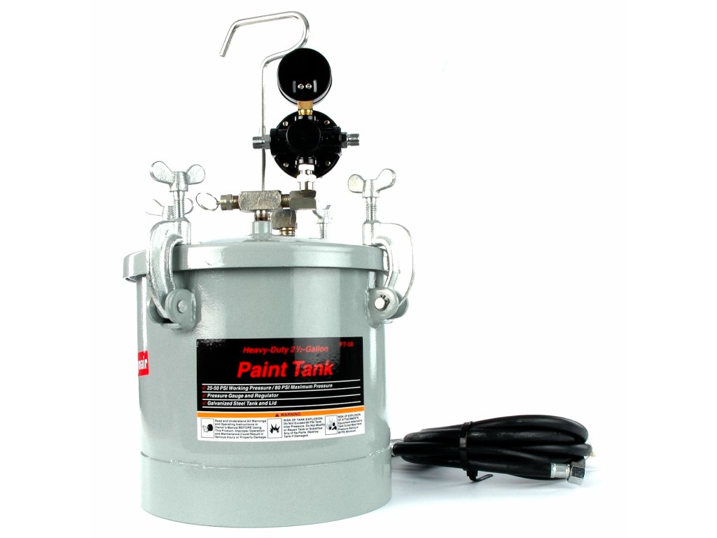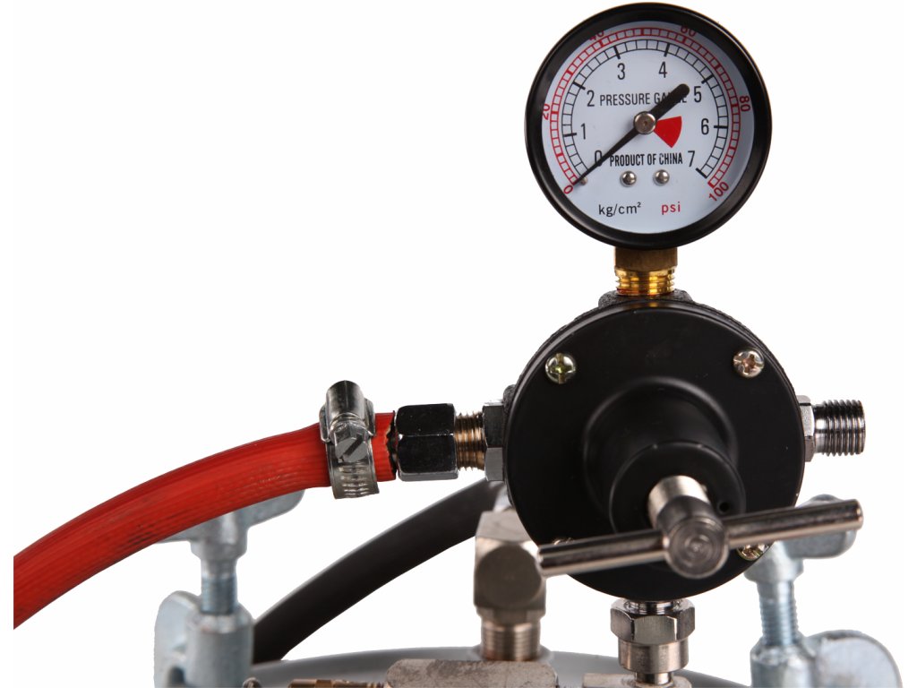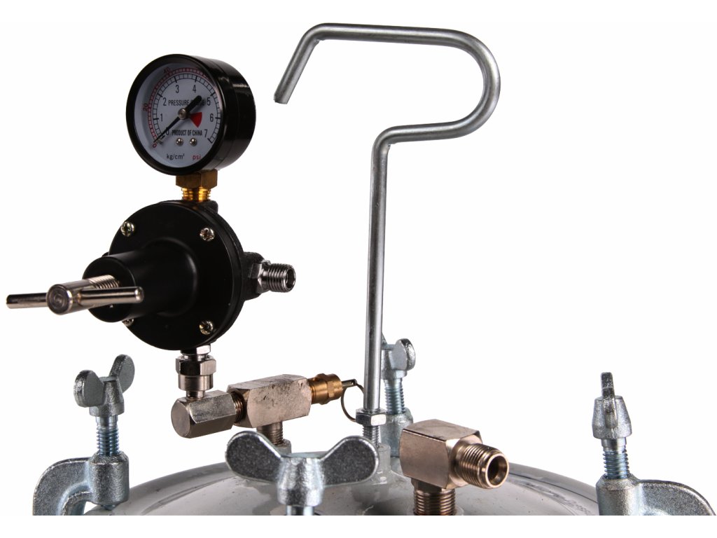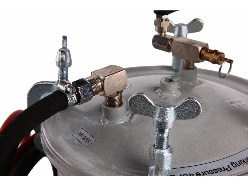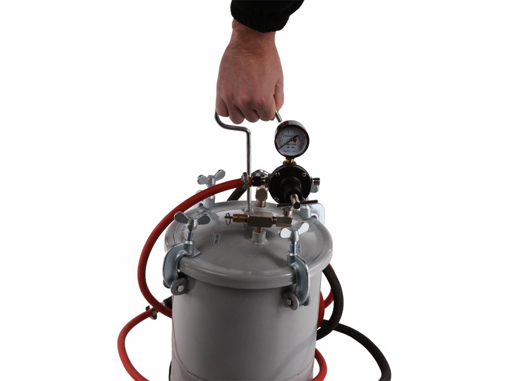 Brizgalno pištolo z zunanjo posodo 8 l. Šoba 1,8 mm, dolžina cevi 3,5 m. Delovni tlak 3,5 – 5 barov. 1/4" povezava. Primerno tudi za barve na vodni osnovi.