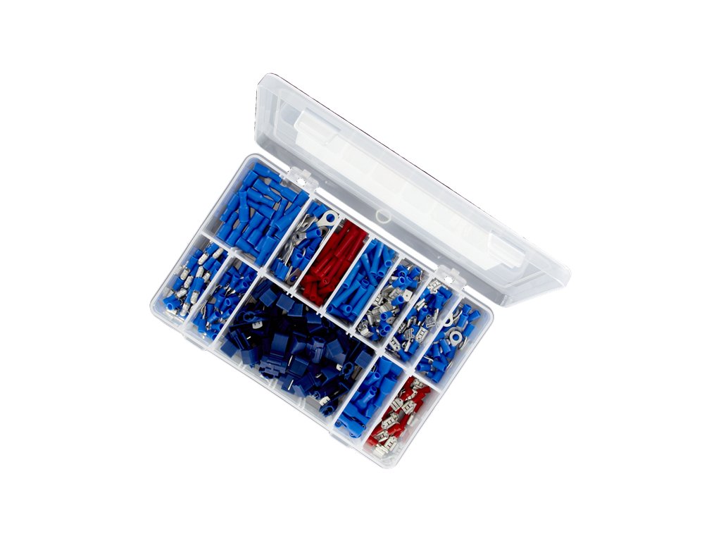 Komplet priključkov in priključkov za zaključevanje kablov avtomobilske električne opreme v plastičnem organizatorju s pokrovom.