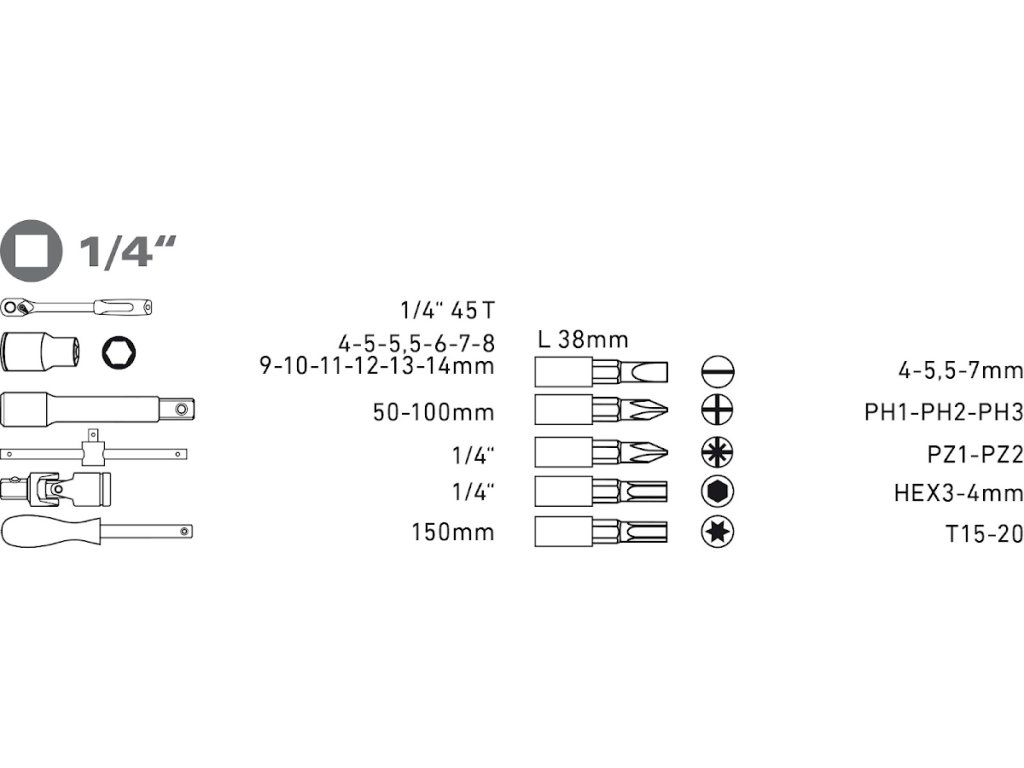 - glava vtičnice: 1/4": 4 - 5 - 5,,00 5 - 6 - 7 - 8 - 9 - 10 - 11 - 12 - 13 - 14 mm