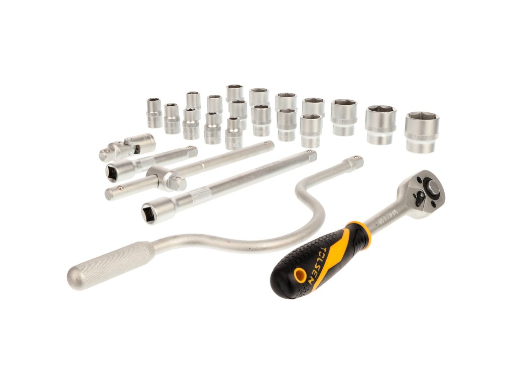 Vključuje 1/2" zaskočnik, zgibni pritrditev, podaljške 127 in 254 mm, ročaj "T", upognjen ročaj in vtičnice 10, 11, 12, 13, 14, 15, 16, 17, 18, 19, 20, 21, 22, 23, 24, 27, 30 in 32 mm. Material: Cr-V jeklo, dobavljeno v kovinskem ohišju.