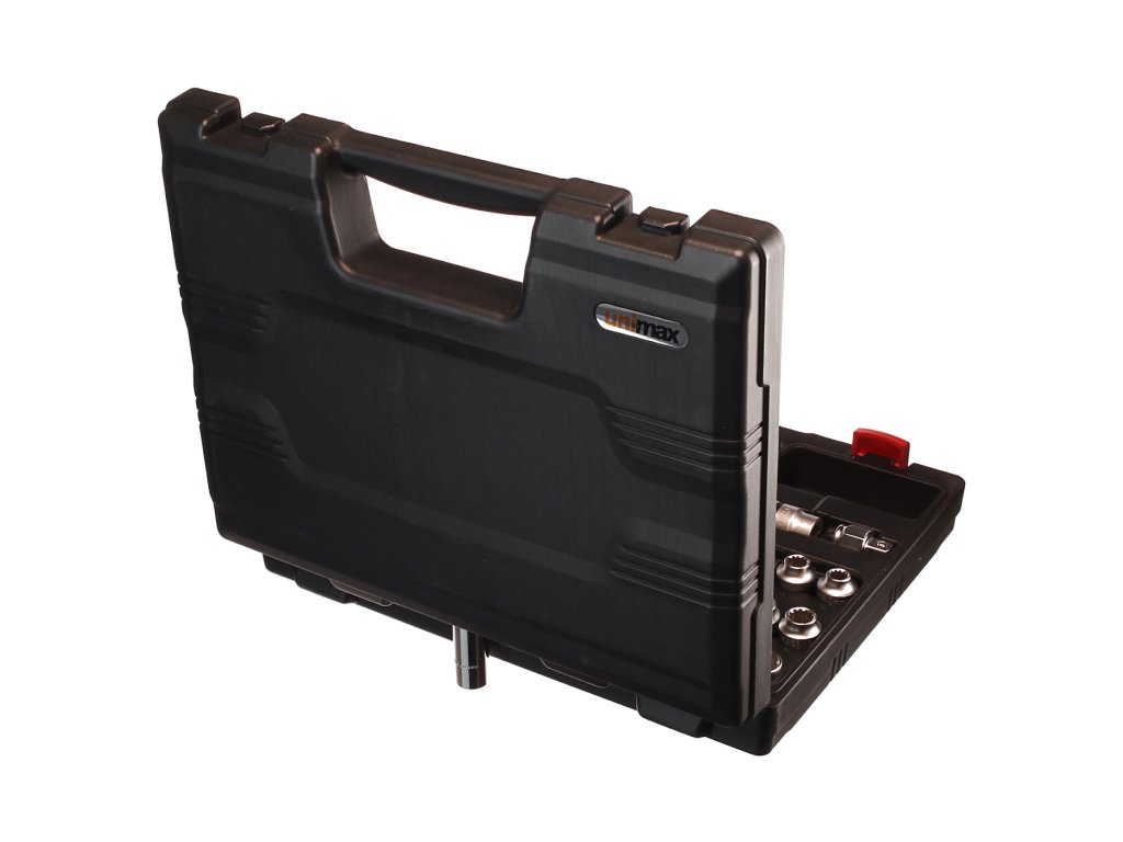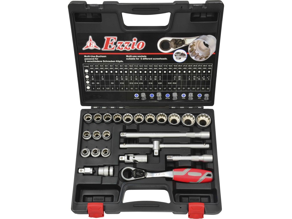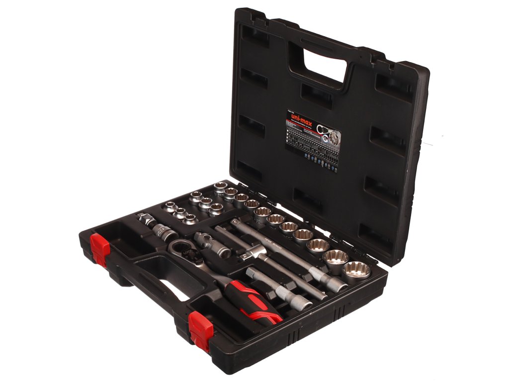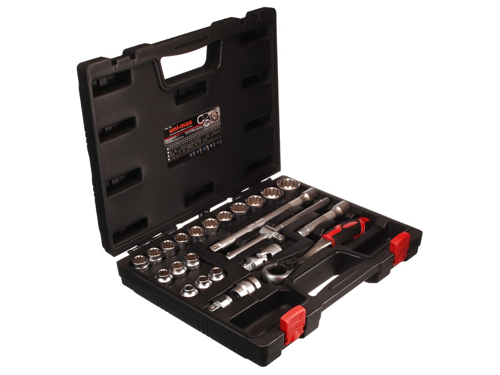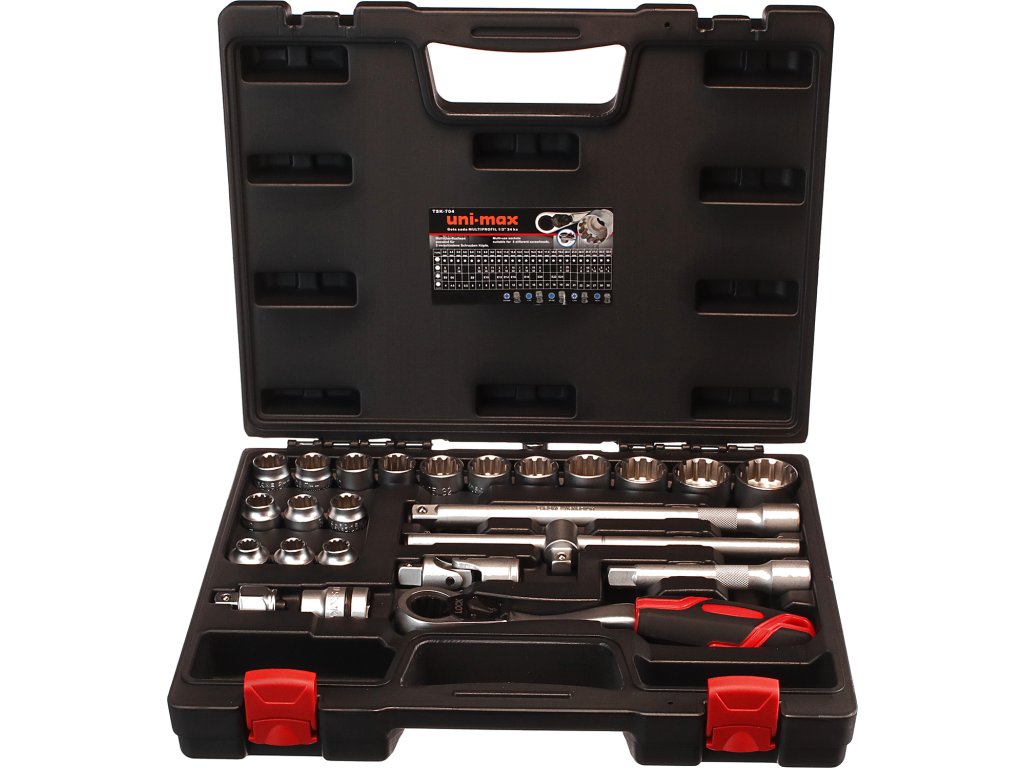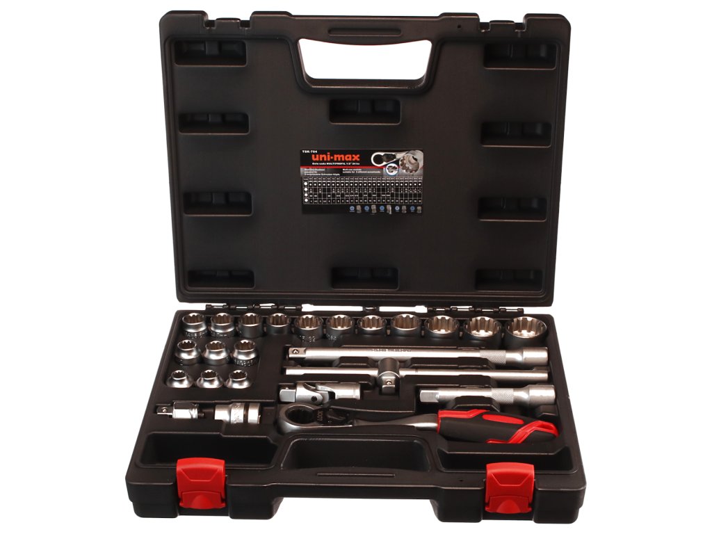 Vsebuje 17 kosov večprofilnih 1/2" vtičnic, primernih za 5 vrst glav vijakov, zaskočnik z 1/2" adapterjem z mehkim ročajem, podaljški 125 in 250 mm, vpenjalni, zgibni in vtični adapterji ter drsni ročaj "T" 250 mm. Material: CrV jeklo, dimenzije vtičnic: 10, 11, 12, 13, 14, 15, 16, 17, 18, 19, 20, 21, 22, 24, 27, 30 in 32 mm.