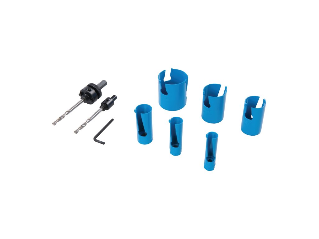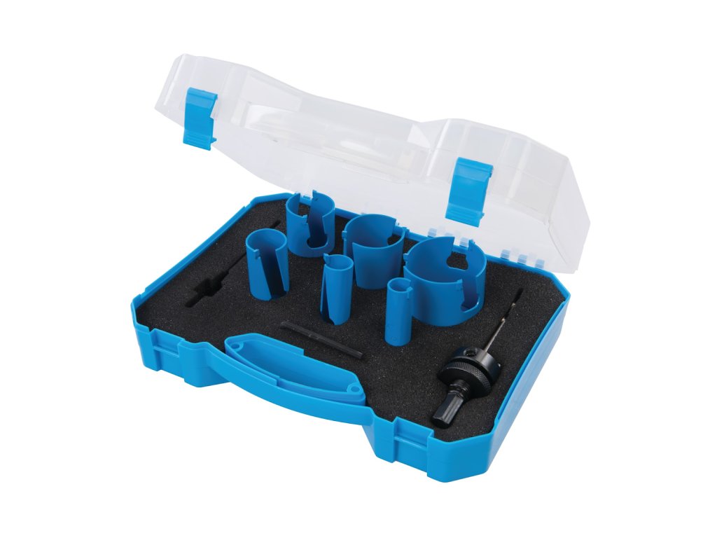 Močni in trpežni zobje iz volframovega karbida za dolgo življenjsko dobo in zmogljivost. Hitro odstranjevanje odpadkov. Za drywall, opeko, gazirani beton, les, vezan les, laminat in PVC. Vključuje 1 tipko Allen, 2 x vodilne svedre in 6 x TCT svedre (19, 22, 29, 38, 44 in 57 mm).