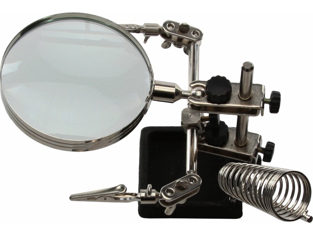 Držalo za mizo s povečevalnim steklom in stojalo za konico spajkalnika. Lupa ima premer 90 mm, povečava 2-krat. Čeljusti in povečevalo so zaradi več spojev nastavljive v idealen položaj.