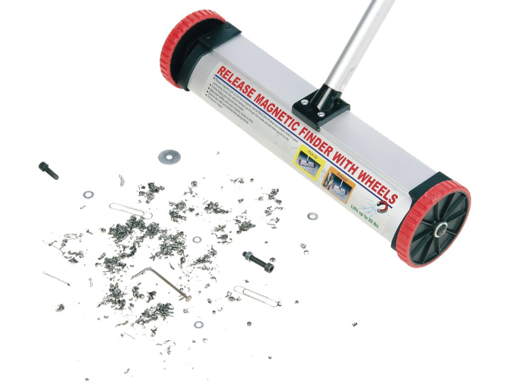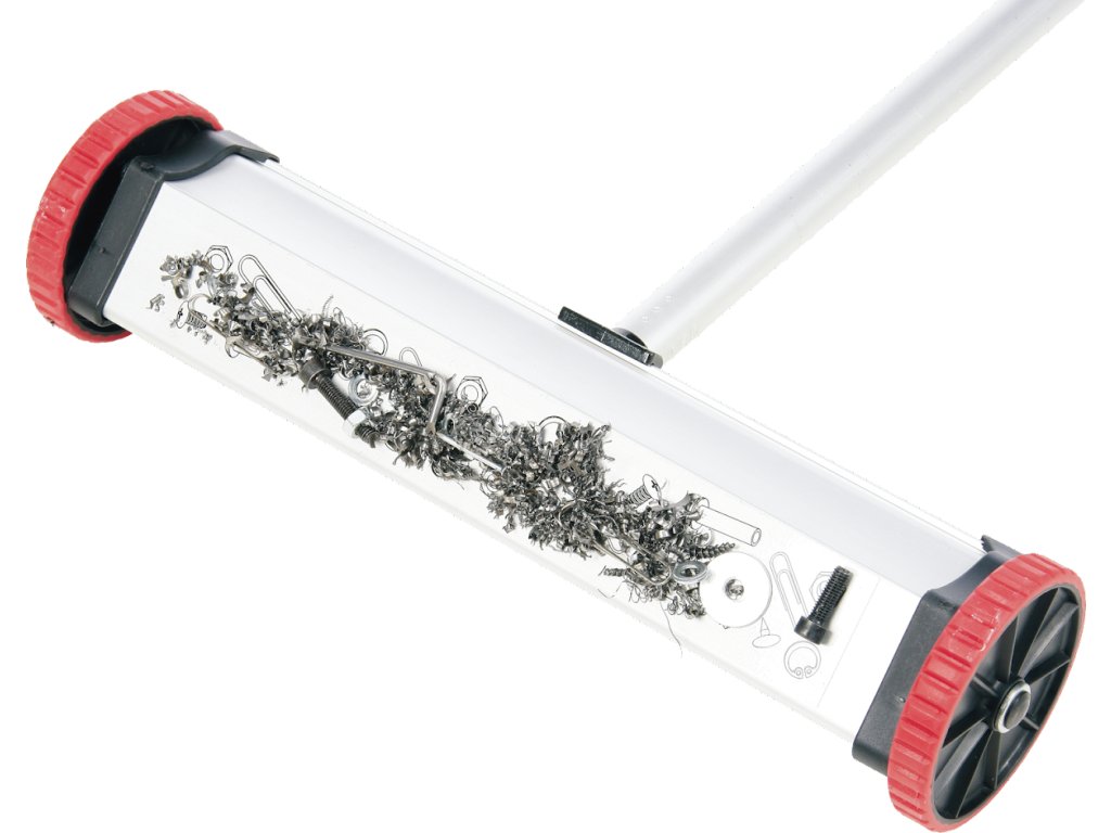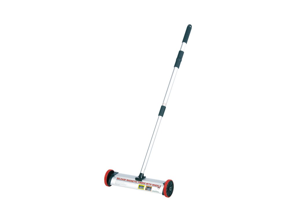 Revolucionarna metla, ki pometa le majhne jeklene predmete. Učinkovito sredstvo za izbiro odpadnih kovin je opremljeno s kolesi, obloženimi s trpežnim PU materialom. Magnetna sila 90 N. S preprostim upravljanjem z ročajem se lahko ujeti material sprosti. Primerno za manjše kovinarske delavnice ali mizarske delavnice za zbiranje padlih vijakov ali žebljev. Teleskopska palica največja dolžina 1.040 mm, širina kolektorske palice 320 mm.