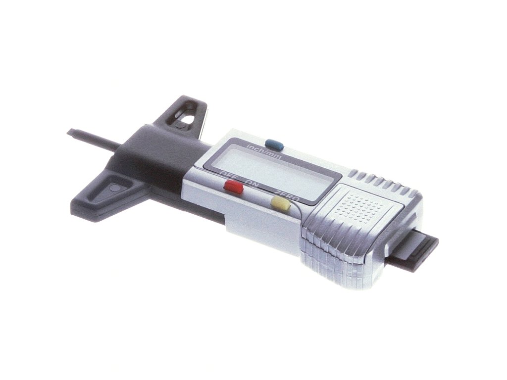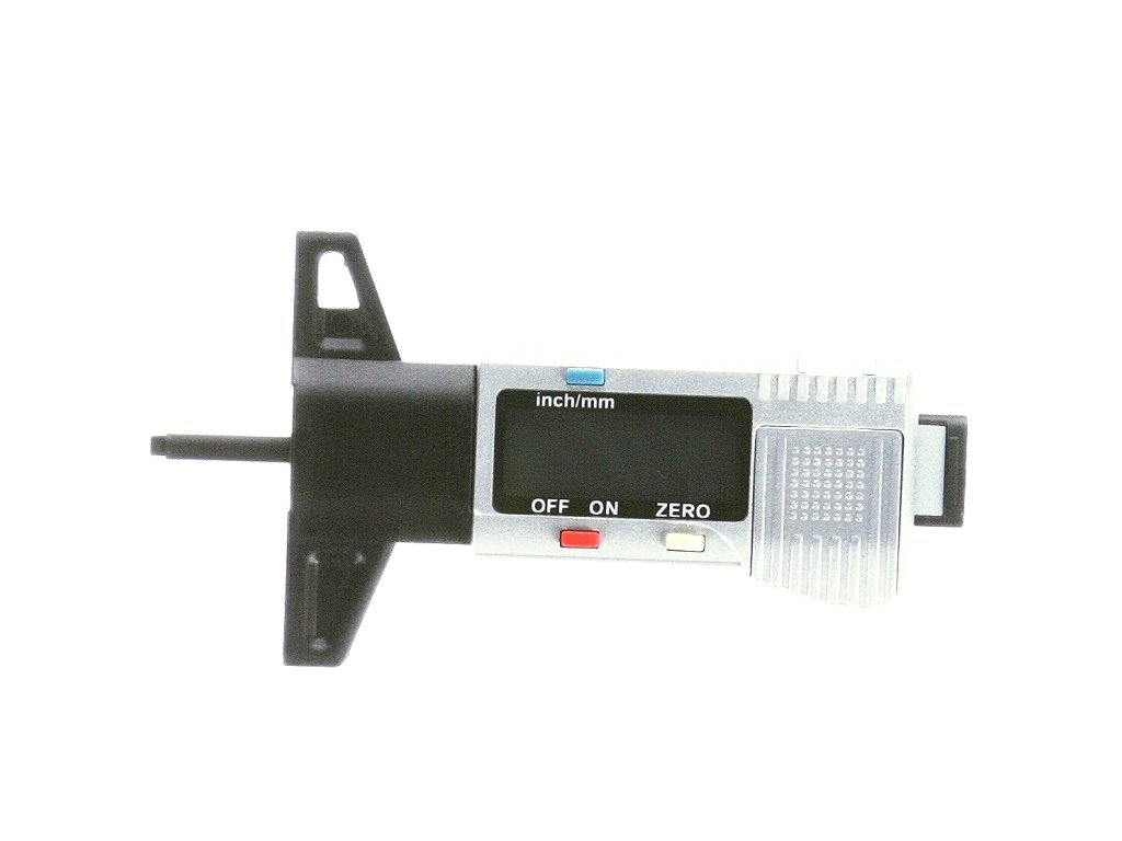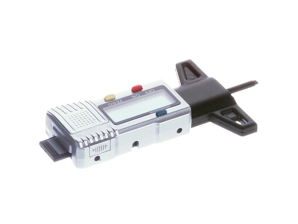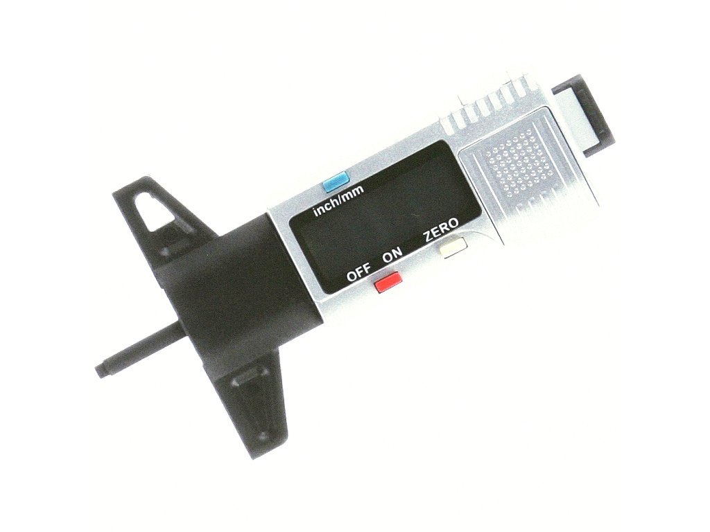 Merilnik globine tekalne plasti pnevmatike z velikim LCD zaslonom. Enostavno upravljanje, samodejni izklop, merjenje v mm ali palcih, merilno območje 0 - 26 mm, ločljivost 0,01 mm, natančnost ± 0,2 mm, napajan z 1× CR2032 3 V baterija - ni priložena.
