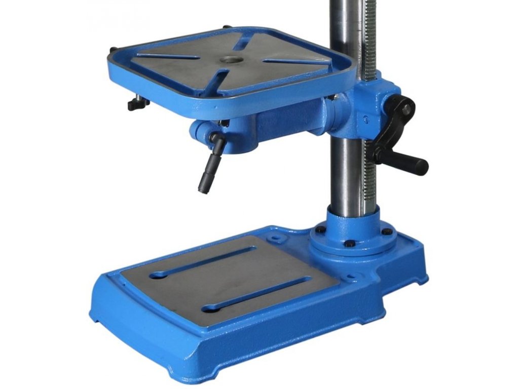 Konstrukcija: par stožčastih zobnikov (2), vreteno s stožčastimi oprijemi/natančnimi krogličnimi ležaji, stožčasti trn MK2, robustna vrtalna miza (→ L × W: 245 × 245 mm; s prečnimi utori za pritrditev vise), stoječa plošča iz litega železa (→ L × W: 245 × 410 mm, vključno z izvrtinami za stacionarno sidranje vrtalnika).