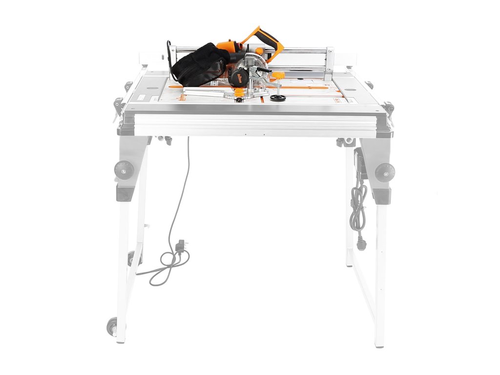 Žaga z močjo 910 W s premerom rezila 127 mm za prosto vodenje in vpenjanje v mizi, ki deluje kot namizno orodje ali v agregaciji z delovnim centrom TWX7. Tlačno lita aluminijasta podlaga z metričnimi in palčnimi tehtnicami, vodili z dvojno jekleno žago. Disk Ø 127 × Ø 17 mm × 14 zob. Žago lahko vpete v mizo ali uporabite s prostim vodenjem za širok razpon mitre in prečnih rezov, če jo uporabljate s priloženo kotno zaustavitvijo z vgrajeno sponko za hitro sprostitev. Globina rezanja do 22 mm. Idealno za natančne in hitre reze v različnih materialih, vključno z laminatom, talnimi oblogami, dekorativnimi okrasnimi letvami in podstavki. Vključuje disk, zastoj kota, sponko za hitro sproščanje, vrečko za prah, ključ rezila, pomoč pri dovajanju materiala in strojno opremo za pritrditev TWX7.