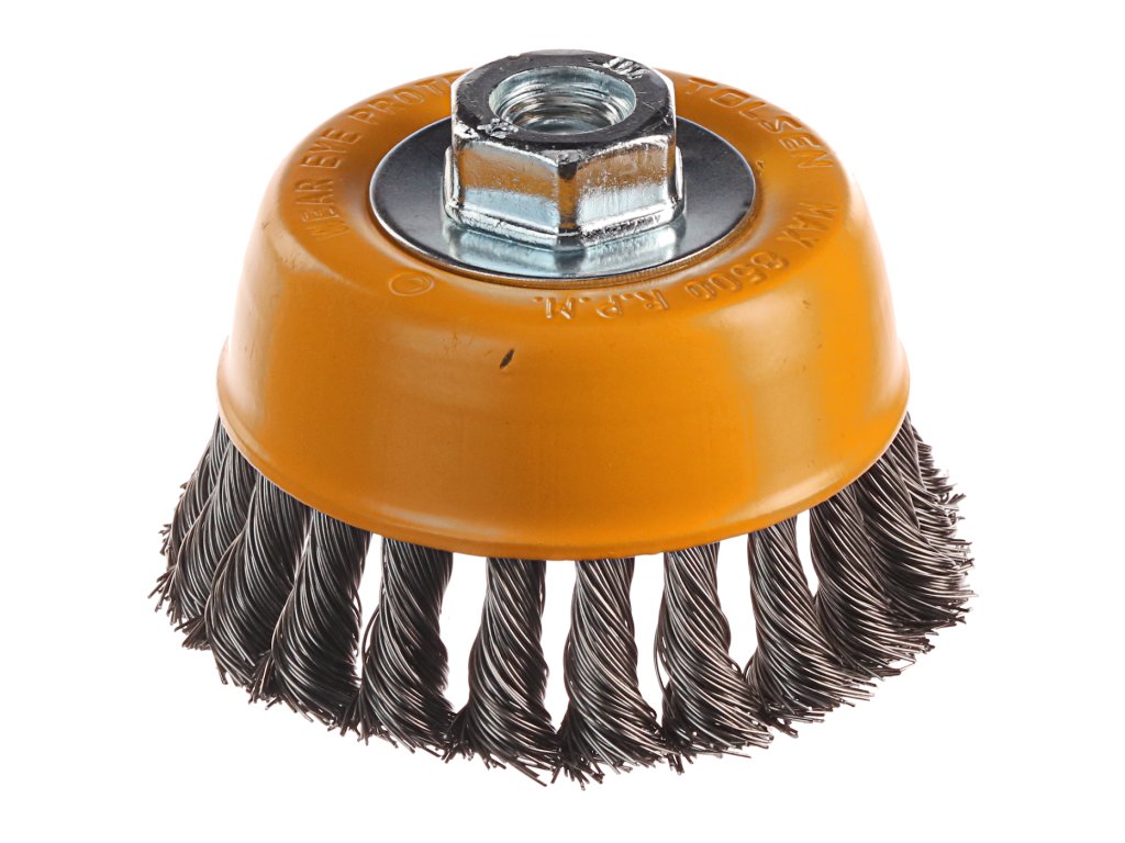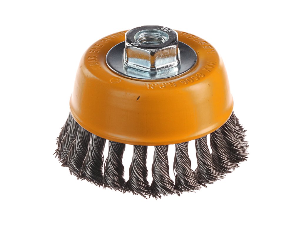 Idealno za odstranjevanje rje in barve s kovinskih površin. Premer žice: 0,5 mm, dolžina pletenice 25 mm, premer krtače 100 mm (premer telesa 85 mm), pritrdilna matica M14 × 2 mm, največja hitrost 8.500 vrt / min, skupna višina ščetke 68 mm.