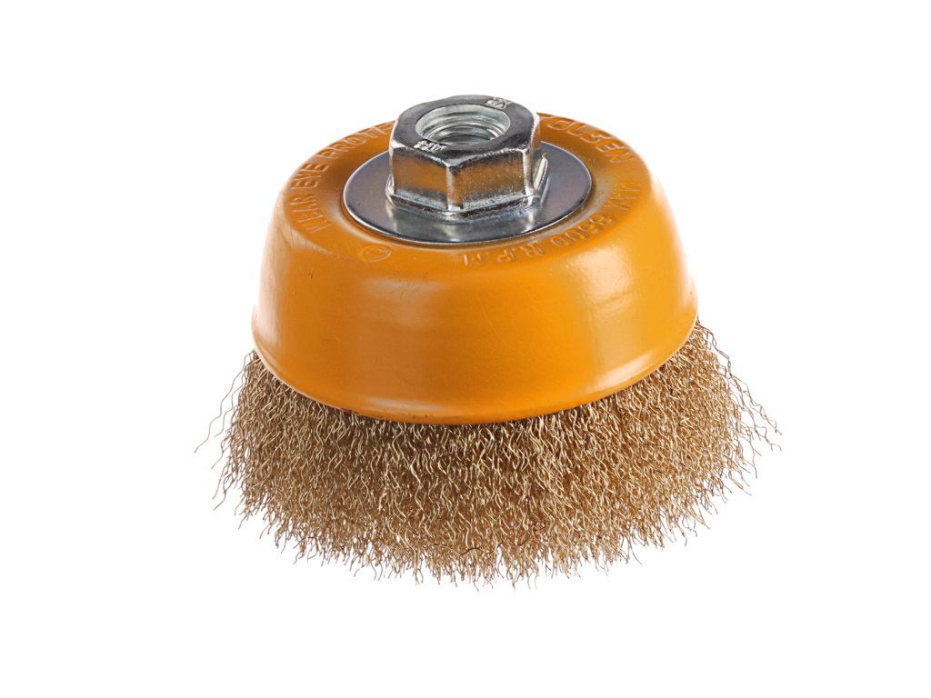 Idealno za odstranjevanje rje in barve s kovinskih površin. Premer žice: 0,3 mm, dolžina žice 30 mm, premer krtače 100 mm (premer telesa 84 mm), pritrdilna matica M14 × 2 mm, največja hitrost 8.500 vrt / min, višina krtače 77 mm.