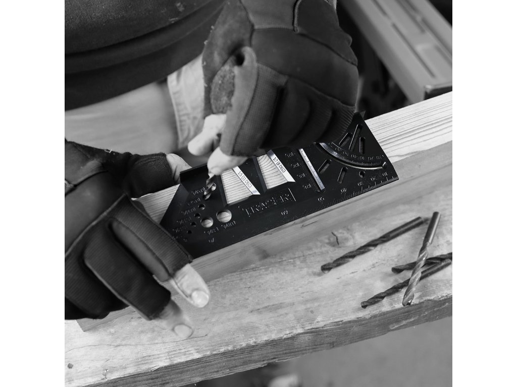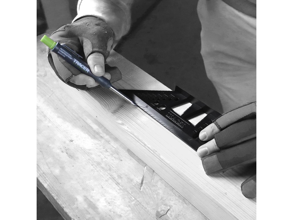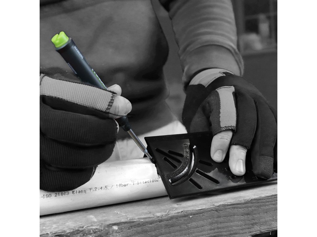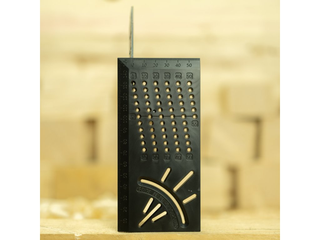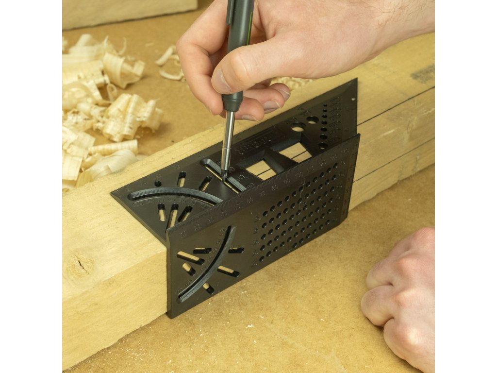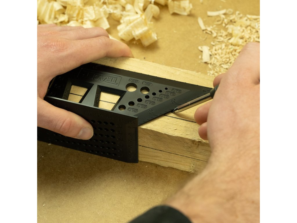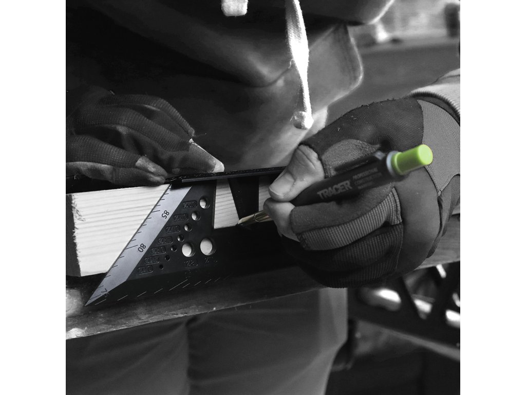 TRACER ProMitre je koristen pomočnik za vsakega mizarja, graditelja, mizarja ali obrtnika. Združuje prednosti več različnih orodij v enem in ima več kot 8 funkcij. Vodoravna in navpična kotna skala: idealna za označevanje kotov od 10 do 80° (+ pripravljene luknje za 30, 45 in 60°). Zahvaljujoč dvojni lestvici lahko označite kot na več področjih lesa hkrati. Ustavitve za vzporedno risanje - na eni strani kvadrata je mreža prednastavljenih lukenj, označenih z 1 mm - idealno za označevanje vzporednih črt od 1 mm do 55 mm.
