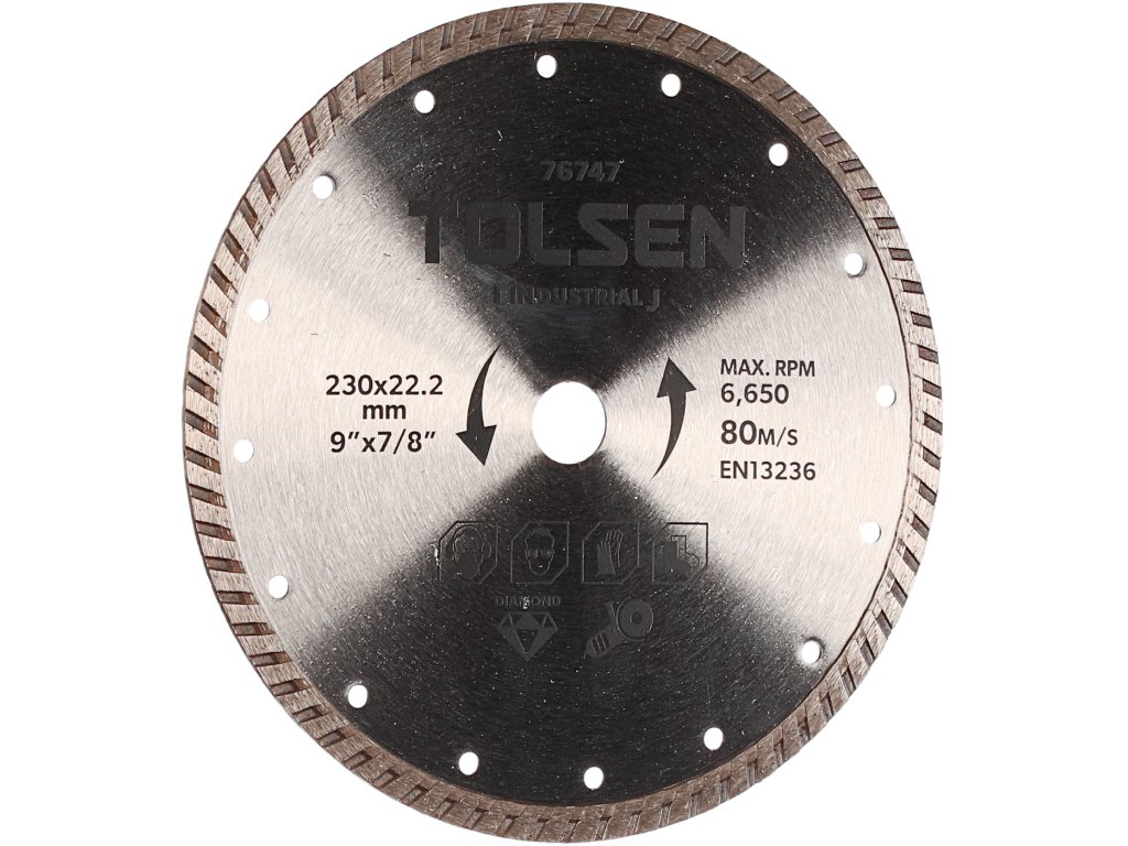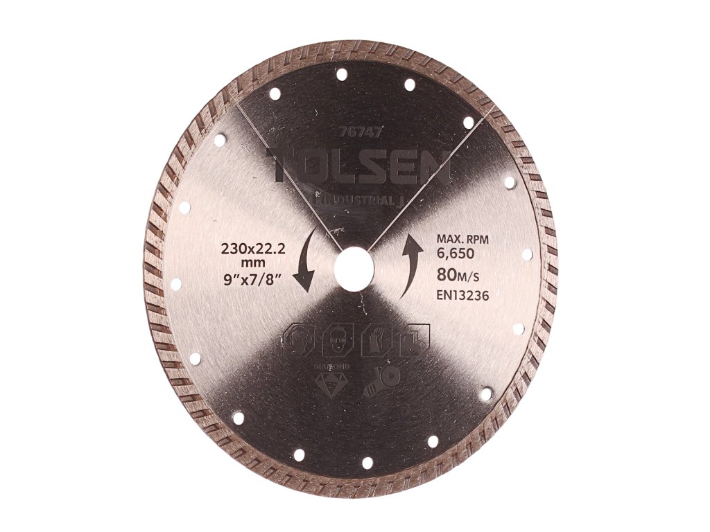 Visokokakovostno diamantno turbo rezilo je namenjeno suhem rezanju zidov, opeke, strešnih kritin in drugih gradbenih materialov. Višina segmenta 10 mm. hitrost: 6.650 vrt./min