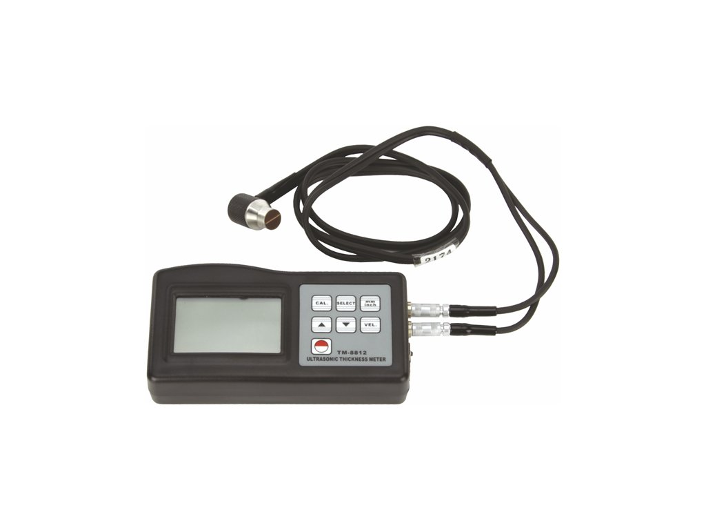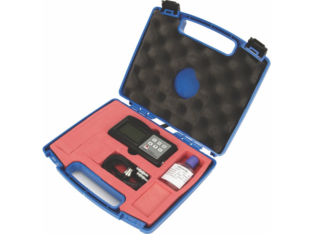 Instrument za merjenje debeline materialov z ultrazvokom (jeklo, lito železo, bron, medenina, cink, steklo, PE, PVC, siva in nodularno železo). LCD zaslon, ki ga napajajo 4 × 1,5 V AAA baterije, merilno območje 1 - 200 mm, ločljivost 0,1 mm, natančnost ± 0,5 %, delovni pogoji 0 - 50 °C, vlažnost < 80 %, dimenzije 120 × 62 × 30 mm.