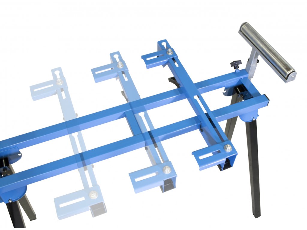 Stabilno pritrdilno stojalo za varno pritrditev stroja (→ maksimalne vpenjalne mere: 450 x 850 mm), nastavljivi dovodni valji (→ projekcija dolžine/višine: 340/145 mm).