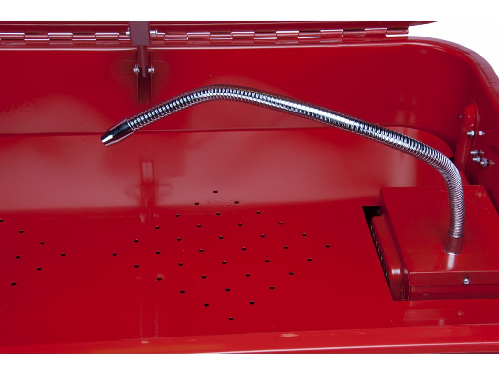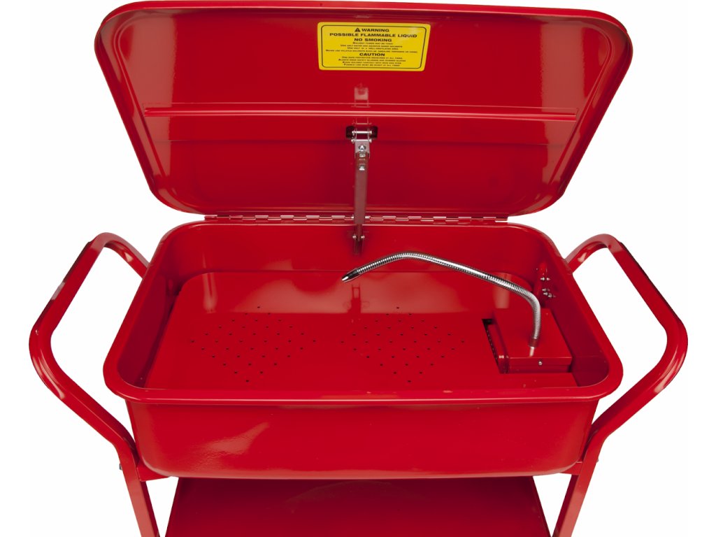 Pralna miza z notranjo prostornino 75 l, pretok črpalke 12 l/min, praktičen perforiran skladiščni prostor s posodo za zbiranje kapljične tekočine za pranje, jeklena zasnova. Kolesa za enostavno upravljanje, 2 z zaklepanjem. Obseg dostave vključuje črpalko in šobo na fleksibilnem vratu. Dimenzije mize: širina 100 cm, višina 90 cm, globina kadi 20 cm. Napetost 230 V/50 Hz.