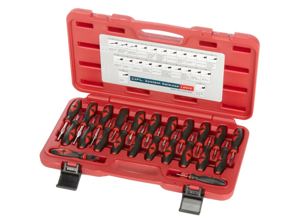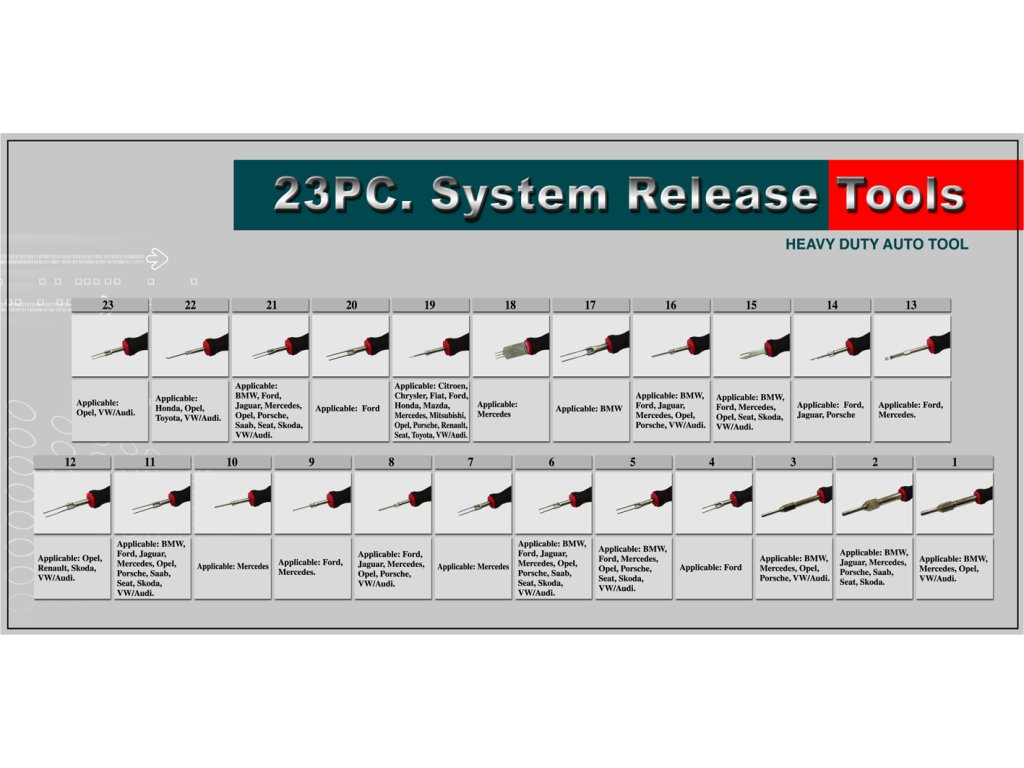 Komplet, zasnovan za odklop priključkov iz kabelskih snopov. 23 kosov posebnega orodja z ročaji pokriva potrebe najpogostejših avtomobilov. Pakirano v plastičnem ohišju.