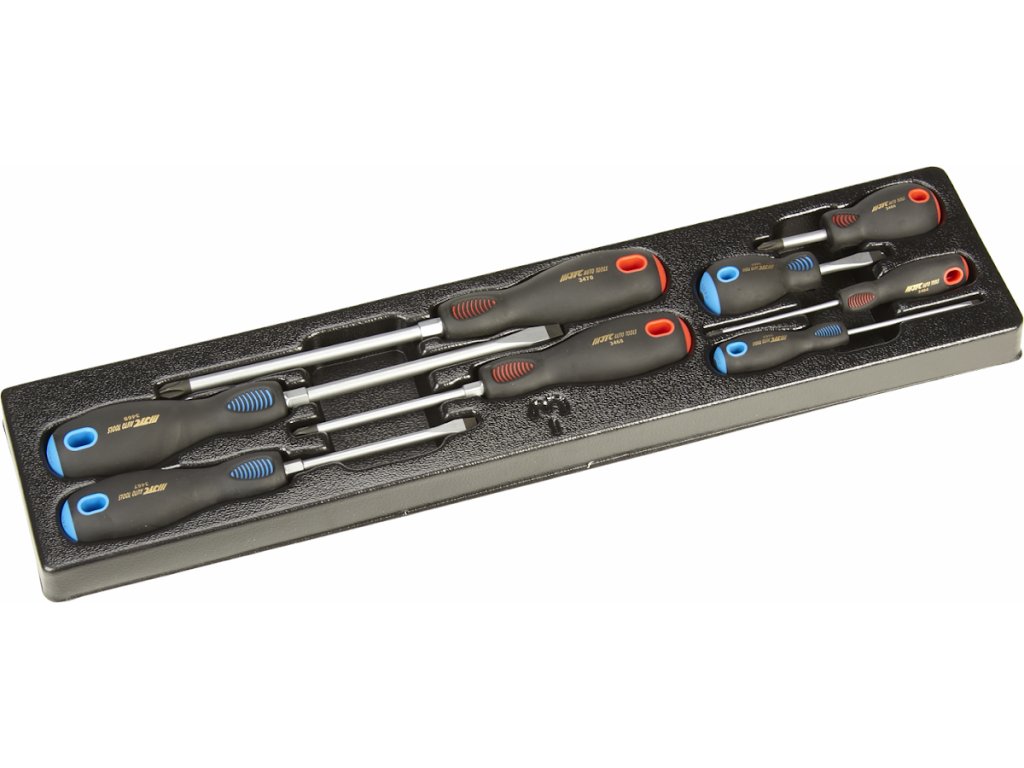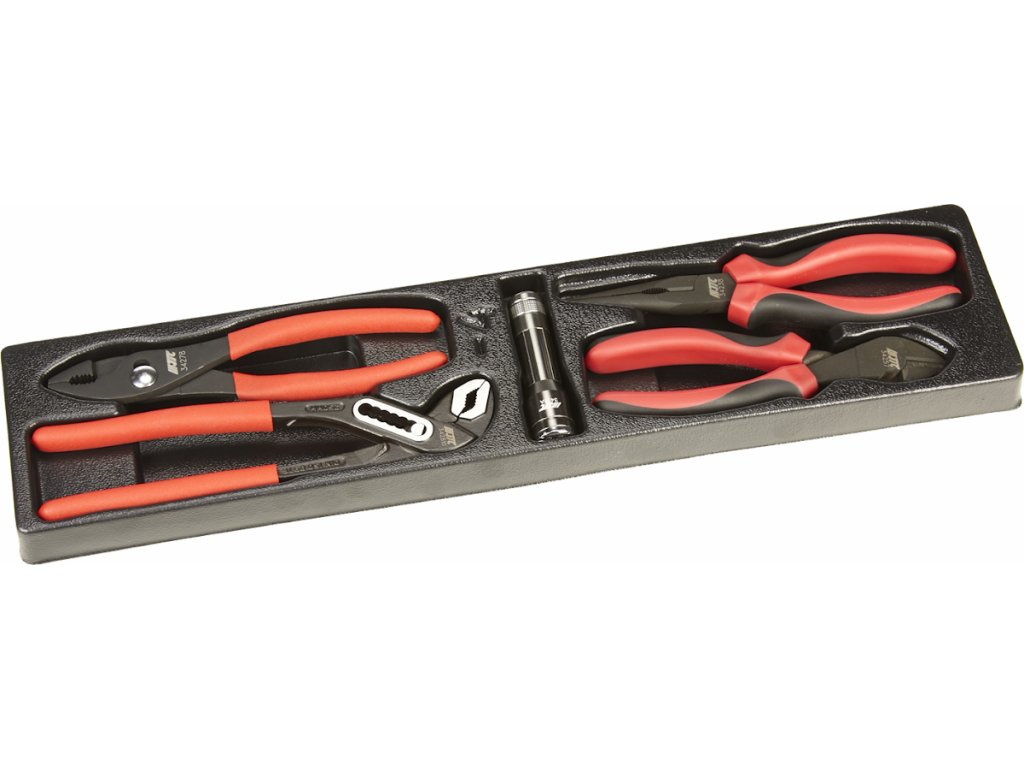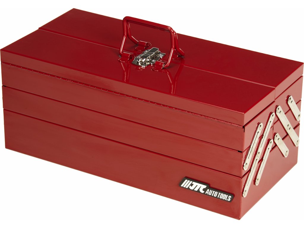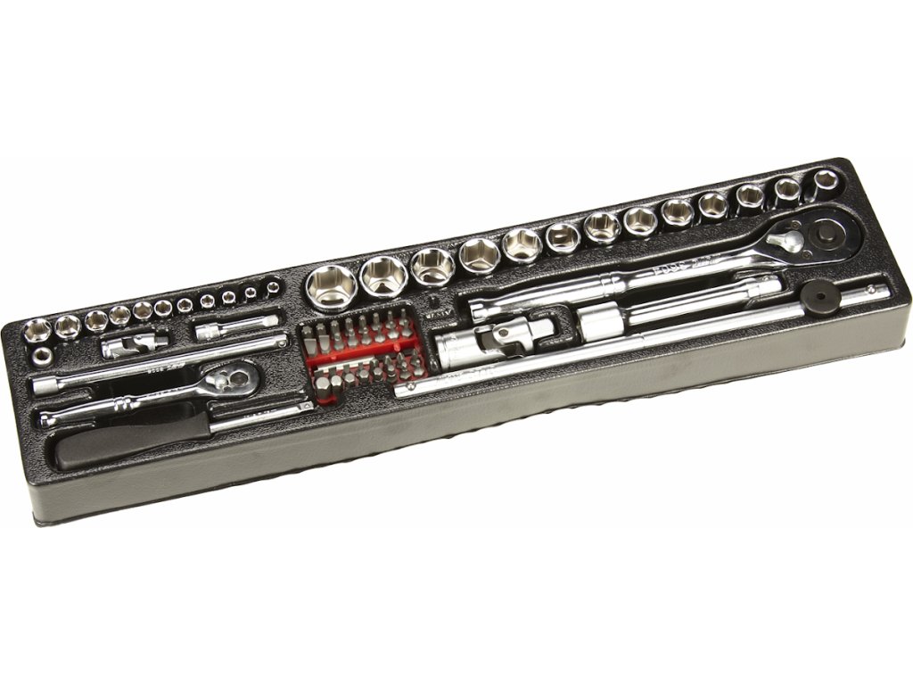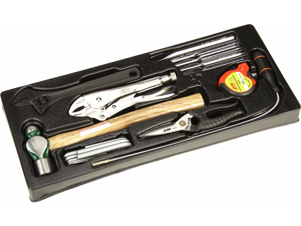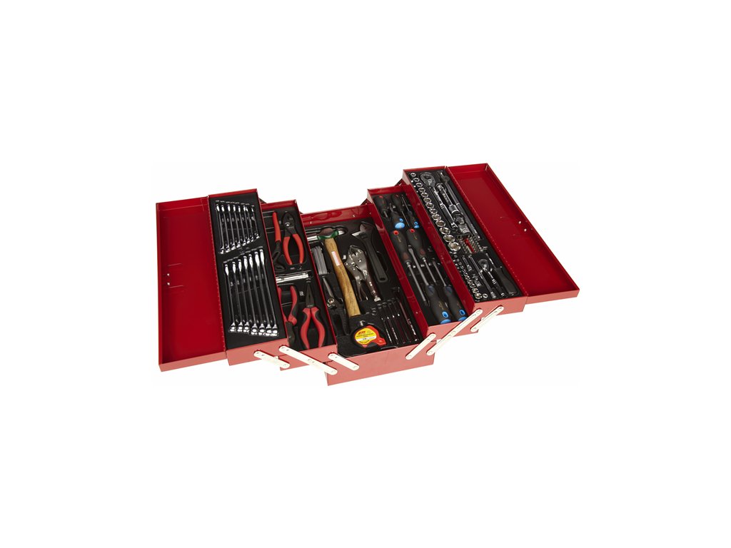 Praktičen mobilni komplet osnovne orodjarske opreme, primerne za servisne posege. Lahko se kadarkoli premakne v vozilo in je pripravljen za akcijo. V petih predelkih, ki so jasno razporejeni, boste vedno našli vse, kar potrebujete za vsakodnevne naloge. Škatla vsebuje komplet kombiniranih ključev, izvijačev, klešč, 1/4" in 1/2" golu, kladivo, 5 m roll-up, sponko za hitro sproščanje, komplet udarcev in Allenovih tipk, nastavljiv ključ, dleto magnet na fleksibilnem vratu in škarje iz pločevine.
