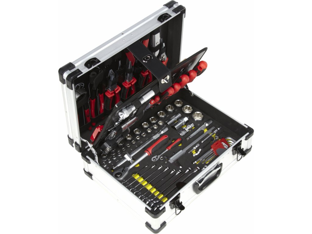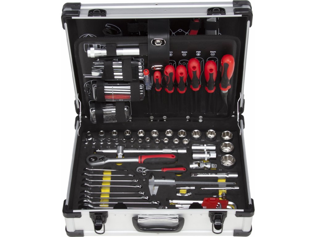 Komplet orodij v ALU ohišju z jasnim organizatorjem vsebuje 1 kos ozkih klešč, 1 kos stranskih nožev, 1 kos kombiniranih klešč, 1 kos škarij, 1 kos klešč za zadrževanje obročev z zamenljivimi čeljustmi, 1 kos klešč "Skil", 1 kos sprednjih klešč, 1 kos noža, 1 kos nastavljivega ključa, 1 kos okvirne žage, 1 kos kladiva, 5 kosov udarcev in dlet, 6 kosov izvijačev, 1 kos 12 V testra, 4 kos finih izvijačev, 31 kosov bitov, 1 kos svetilke, 13 kosov 1/2 "vtičnic + zaskočitev, 13 kosov 1/4" vtičnic + zaskočnik, 2 kosa 1/2 "podaljškov, 2 kosa 1/4" podaljškov, 2 kosa zgibnega pritrditve, 2 kosa svečnih ključev, 1 kos "T", 1 pc sklopka, 1 PC adapter, 1 pc čeljust, 1 pc teleskopski pritrditev z magnetom, 9 kom Allen tipke, 9 kom očesnih ključev. Dimenzije ohišja 48 × 36 × 18 cm.