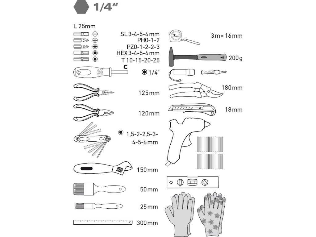 - drugi deli: ravne ščetke širine 25 in 50 mm, jekleni ravnilo 300 mm, nivo libele 170 mm, LED svetilka 60 lm, pinceta z LED lučjo, pištola za vroče taljenje premera 7,2 mm 25 W, vroče taline palice dia. 7,2 mm 12 kosov - mešanica barv in 12 kosov - prozoren
