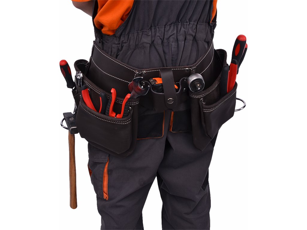 Profesionalna trpežna usnjena torba za orodje s trpežnim usnjenim pasom. Vsaka stran ima 2 večja, 3 manjša žepa in držalo za kladivo. Na sredini je praktičen nosilec ravnila. Za večjo trdnost je vreča dodatno zakovičena.