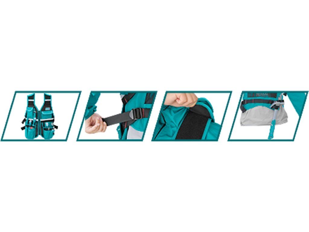 - velikost 42 × 60 × 3 cm, največja obremenitev 3 kg, zračno prepusten material, 12 žepov in 1 držalo za kladivo, nastavljivi trakovi glede na velikost slike