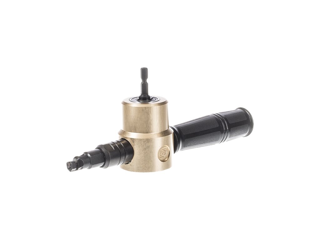 Prav tako je mogoče ustvariti zelo robustne oblike, lahko se uporablja za rezanje ravnih in valovitih pločevin, profilov iz pločevine in cevi. Preprosto se poveže z vpenjalno glavo, hitrost 1.500 – 3.000 vrt / min, ročaji jeklo debeline do 1,6 mm, nerjaveče jeklo 1,2 mm, barvne kovine 2 mm in plastiko do 2 mm. Paket vključuje grizljivo glavo z ročajem.