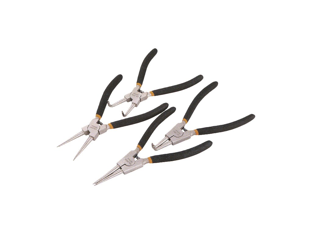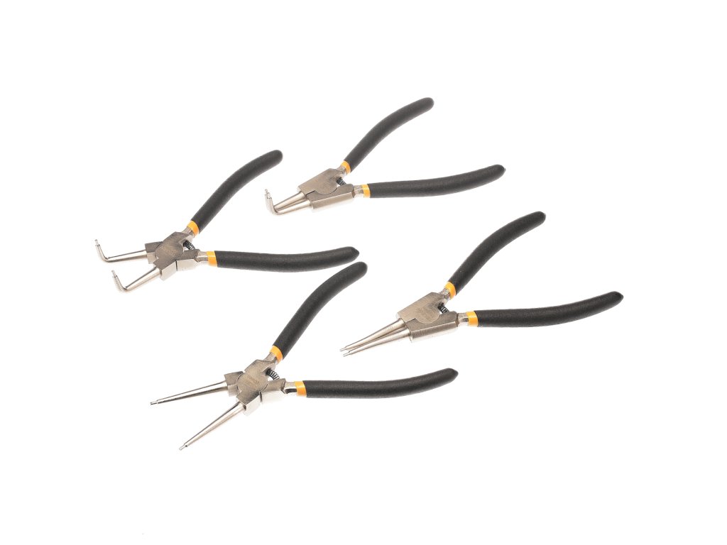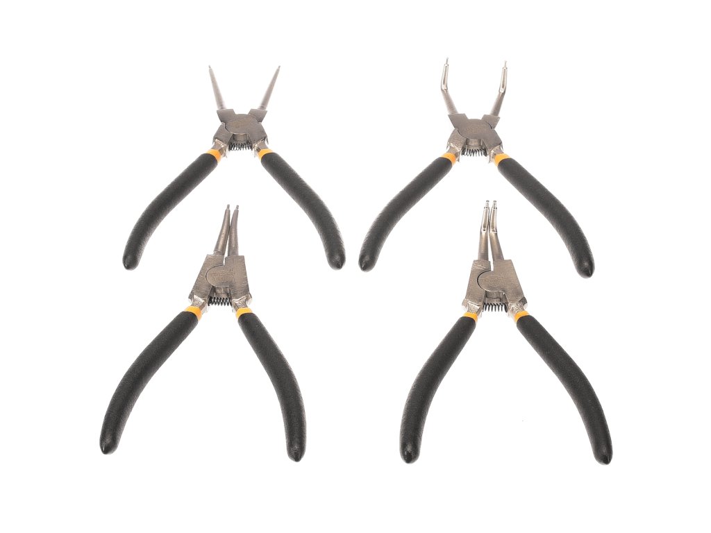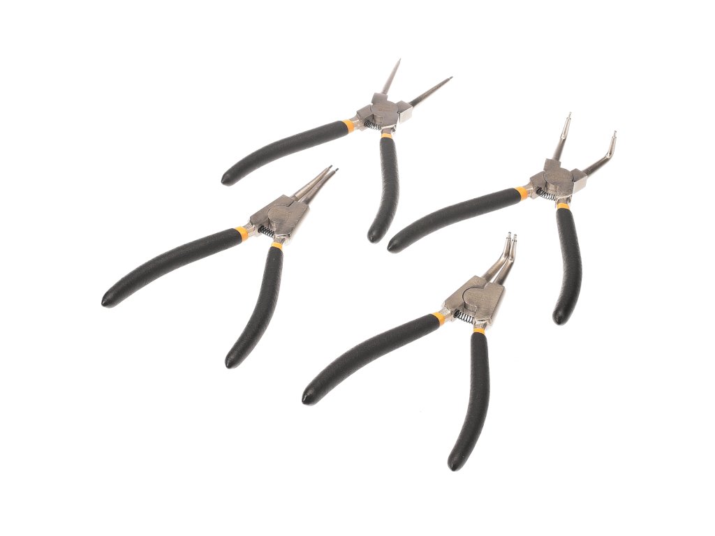 Komplet klešč z ravnimi in kotnimi čeljustmi za montažo in odstranjevanje notranjih in zunanjih zadrževalnih obročev. Klešče so izdelane iz visokokakovostnega ogljikovega jekla z nikljevim zaključkom, ročaji so opremljeni z mehkimi rokavi za udobno delo. Skupna dolžina 180 mm, dobavljena pakirana v pretisnem omotu.
